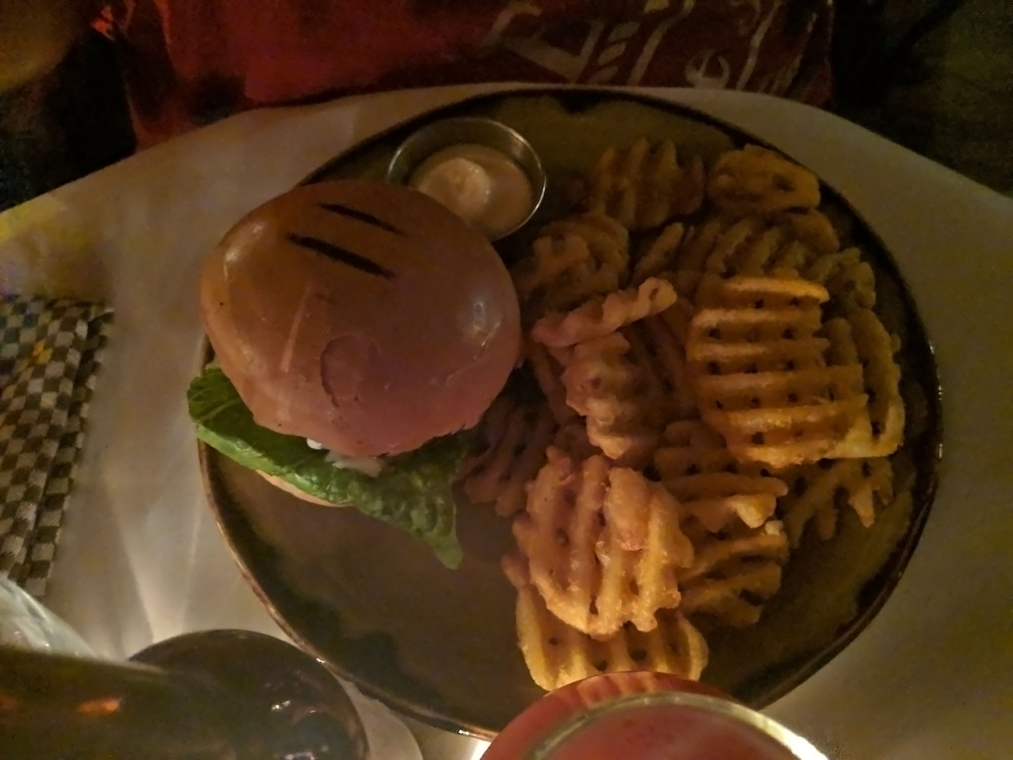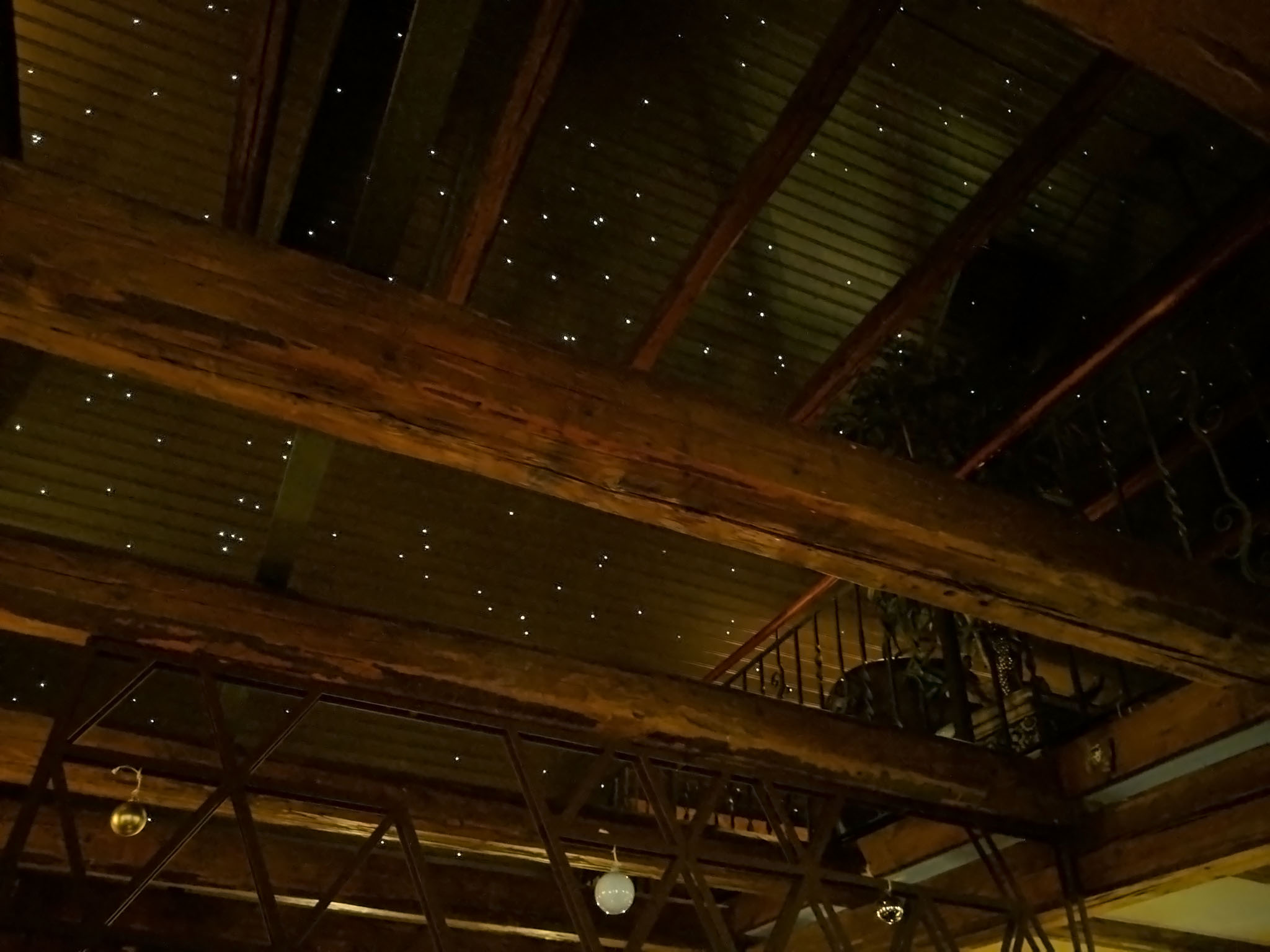 After that it was time to get some food in us and the place we ended up choosing was the Sæta Svínið Gastropub, mere metres from the entrance to our hotel. We weren’t sure we would be able to eat in it at first as the place was absolutely rammed and standing room only but after asking a waitress about the possibility of dining we were led up the steep and narrow set of stairs to the first floor where in a nearly equally-rammed location we were seated at a small table and handed menus. Like several other people there we needed to use the torches on our phones to read the menu as it was stupidly dark but we picked some drinks and food, admired the star effect on the ceiling, then enjoyed everything that turned up.