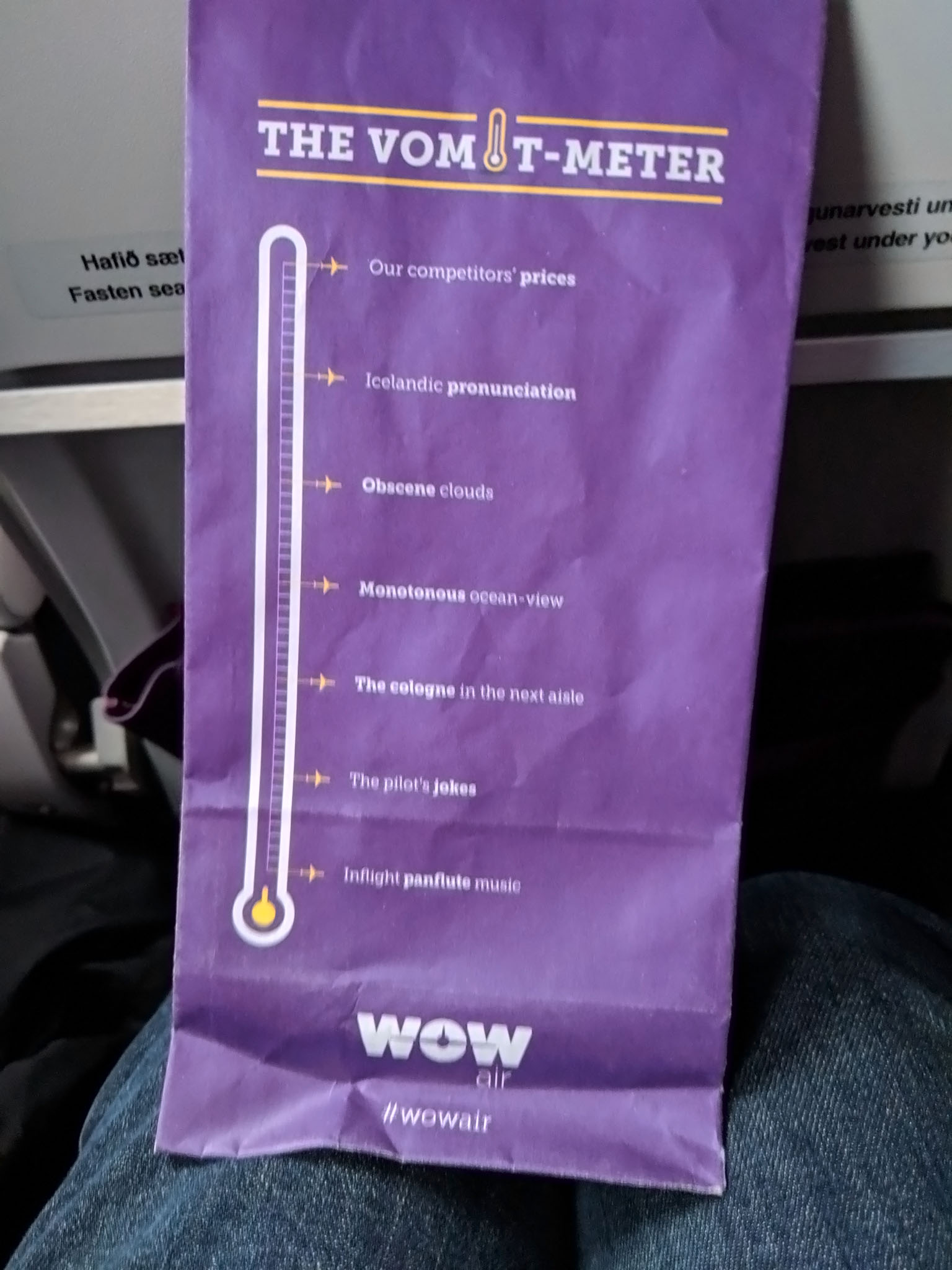 It’s not a great photo but we did like the air sickness bag provided by Wow Air.
