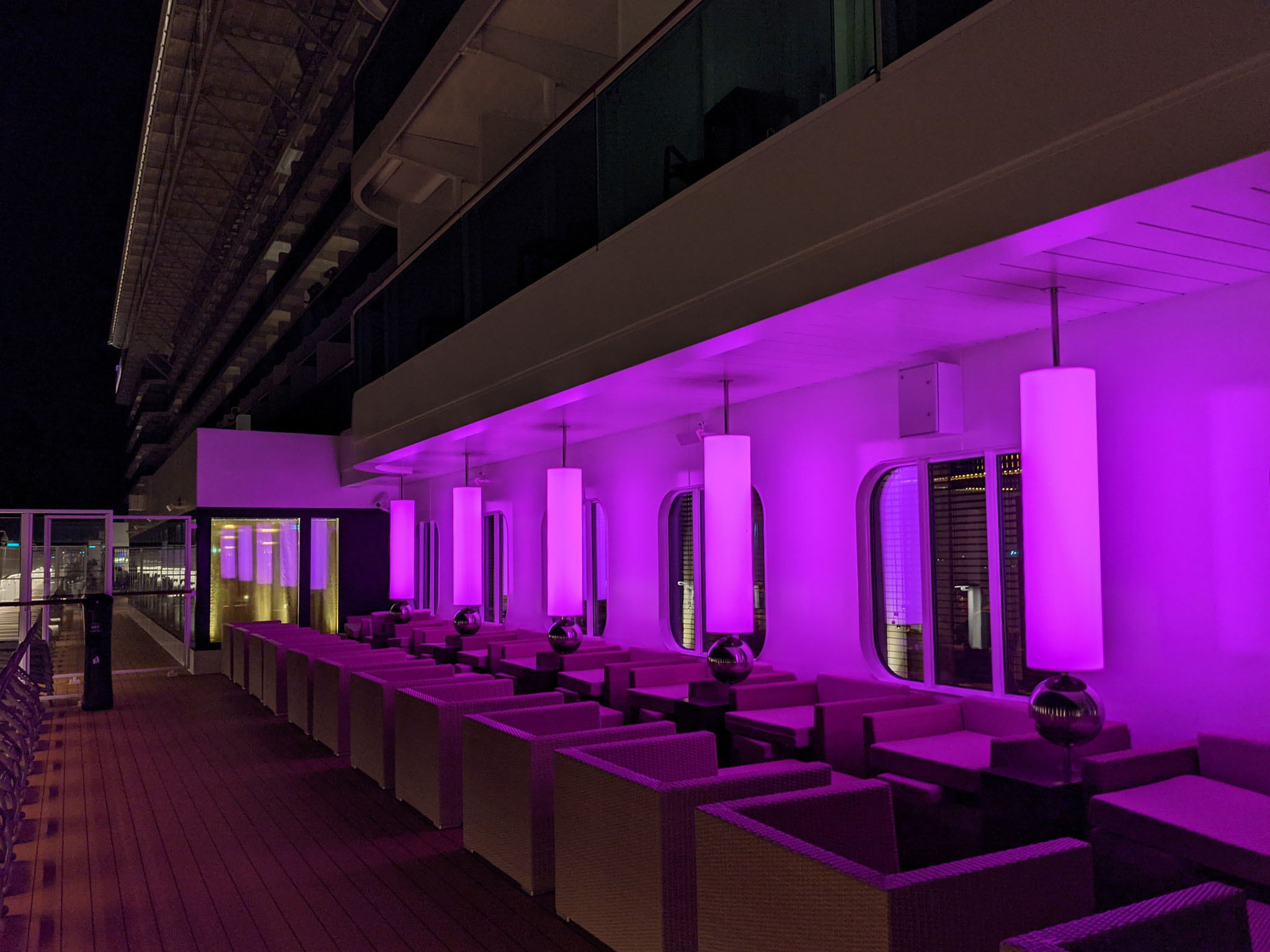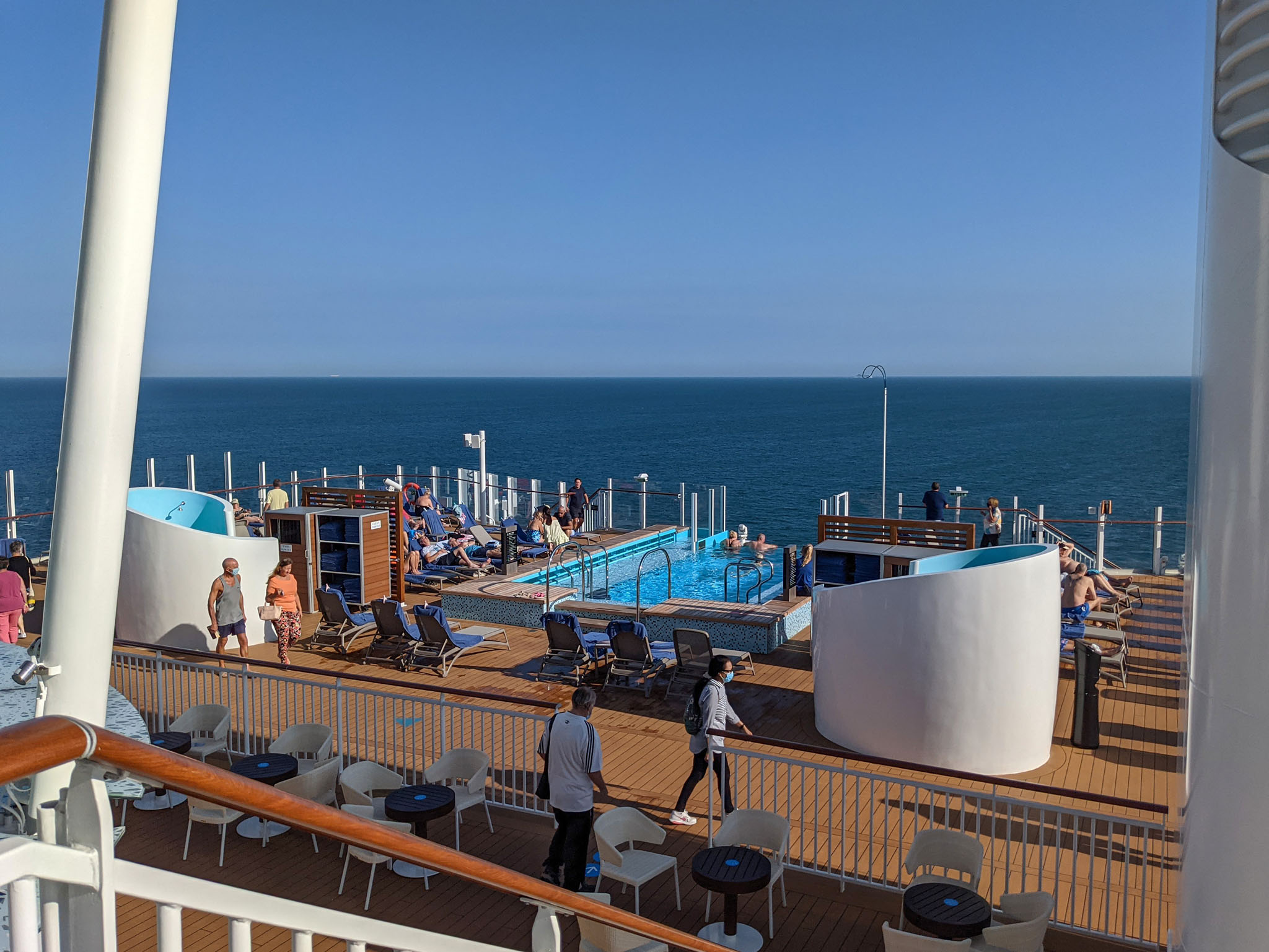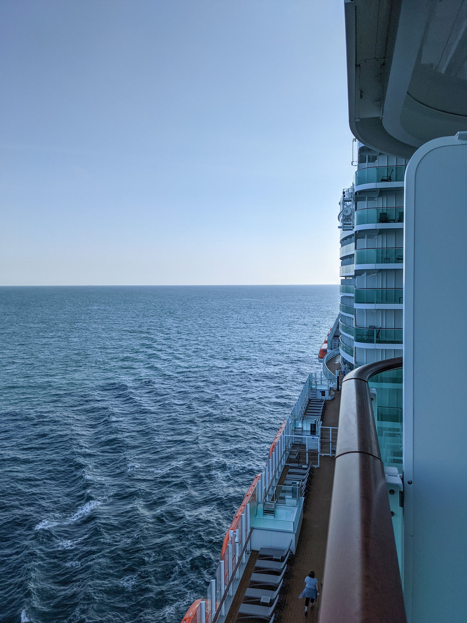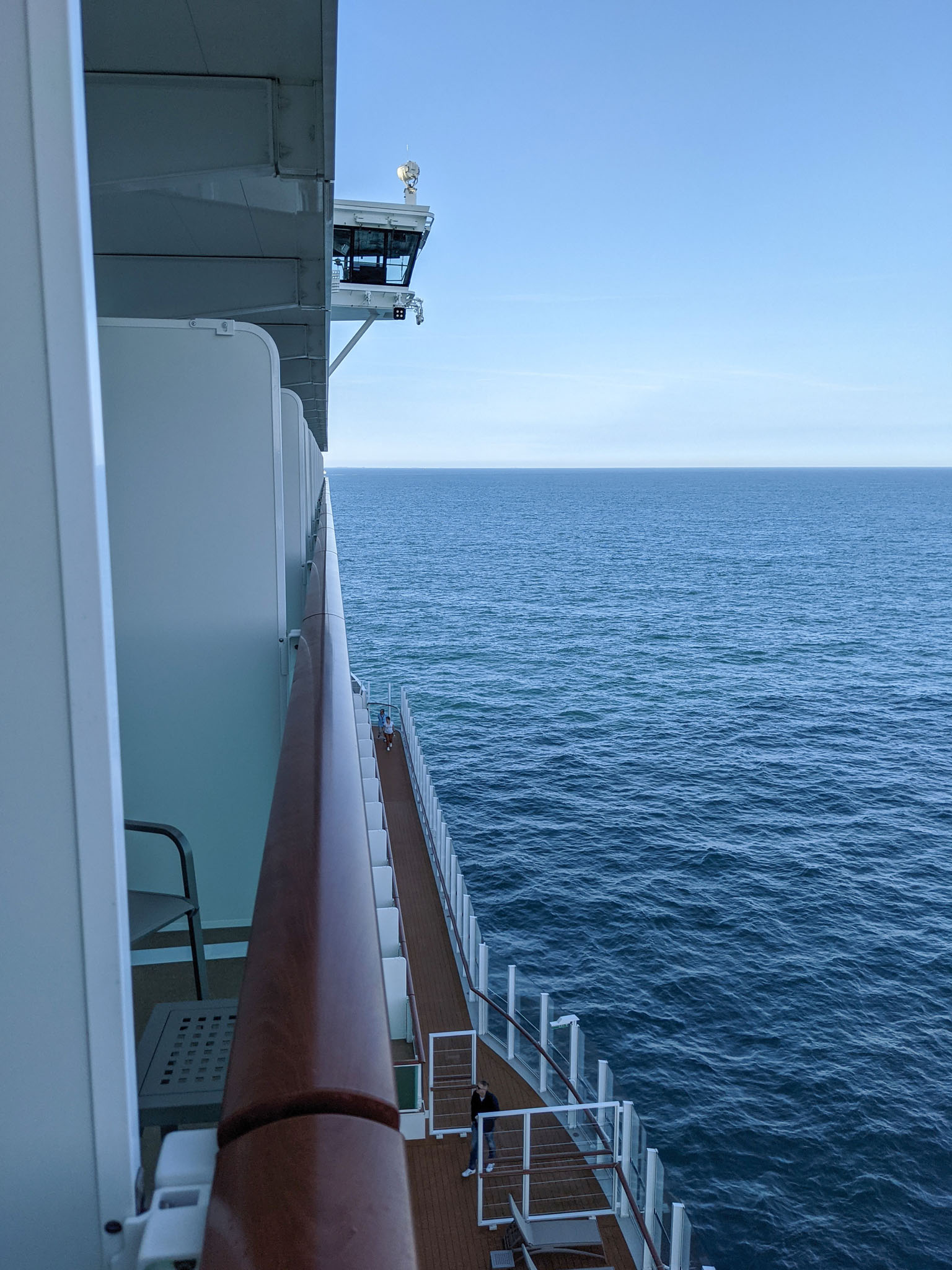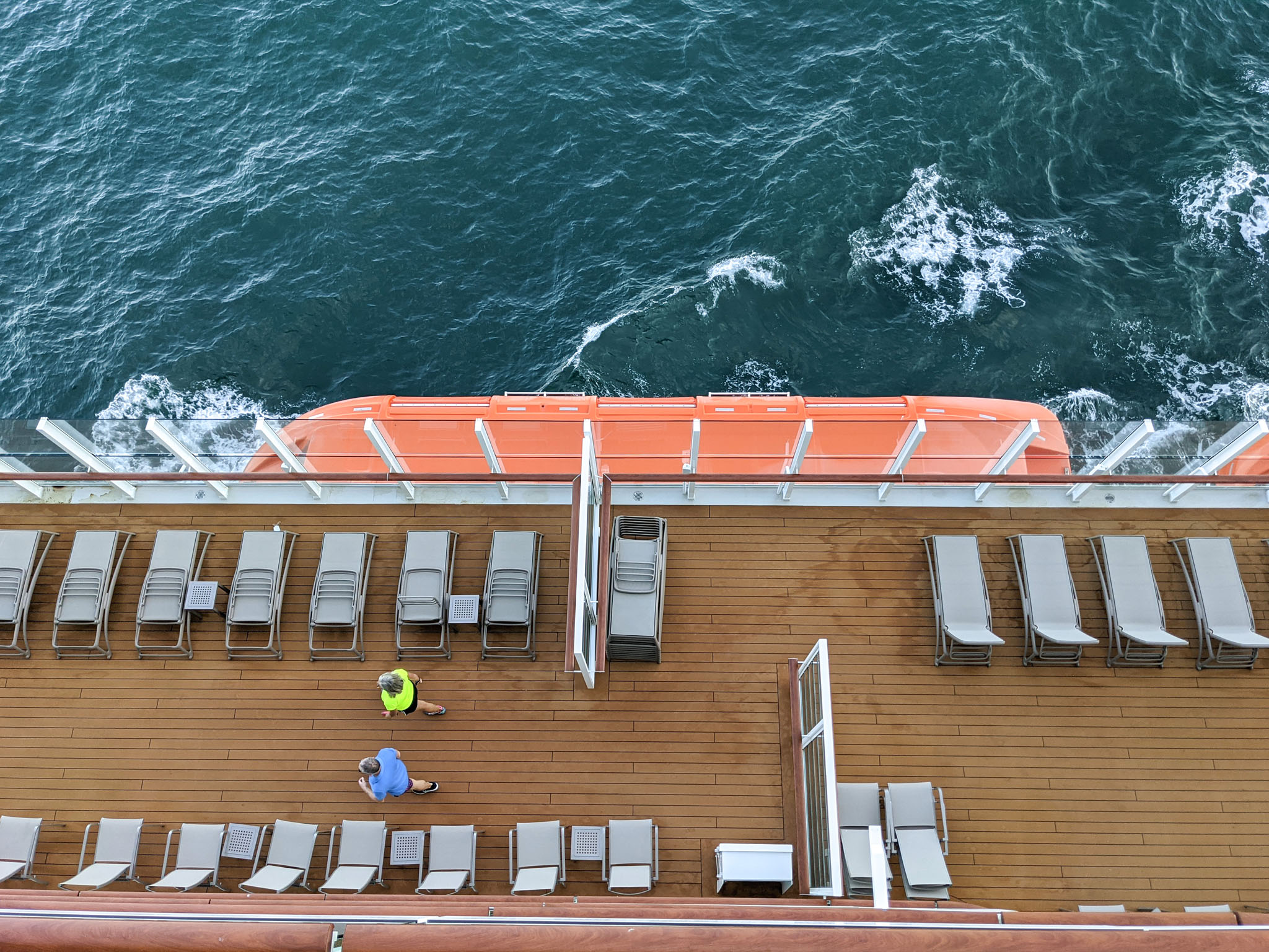 We could look down onto the promenade deck from our balcony where loungers lay in waiting for those who wanted to relax in full view of everyone’s rooms, and where some crazy souls were taking in brisk walks around the ship to burn off calories. Iona is the first ship we’ve been on with an uncovered promenade deck like this set out from the main banks of cabins. We would come to understand on this cruise that the reasoning behind this would be to give more outside space for sun worshippers to make up for the distinct lack of it on the top of the ship. We would come to realise that starry sky worshippers such as ourselves would be fucked over by this decision because the only view we would get at night would be a washed-out, light-polluted glare thanks to the spotlights all along the promenade’s edges. Thanks, P&O. Another one for the list of grumbles.