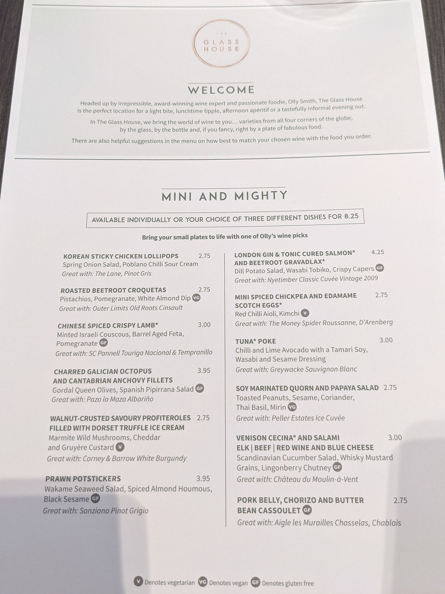 But, the food in the Glass House: yes, it was all very good, and the location around the expansive, light, and airy atrium was very nice. Glass House menus and photos of the dishes we picked are below for you to try to guess what we selected.