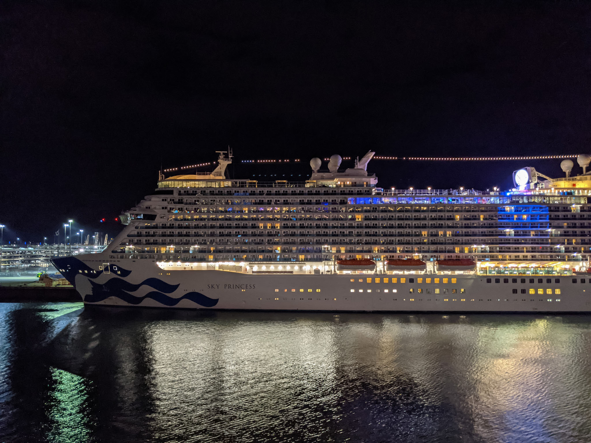 We were pleased to see Sky Princess in dock as we left. Sky Princess would be the cruise ship we would sail on a month after this cruise on Iona (spoiler alert: Sky Princess was fantastic!) and we could hear loud music and see flashing lights on the mostly empty vessel as we glided past.