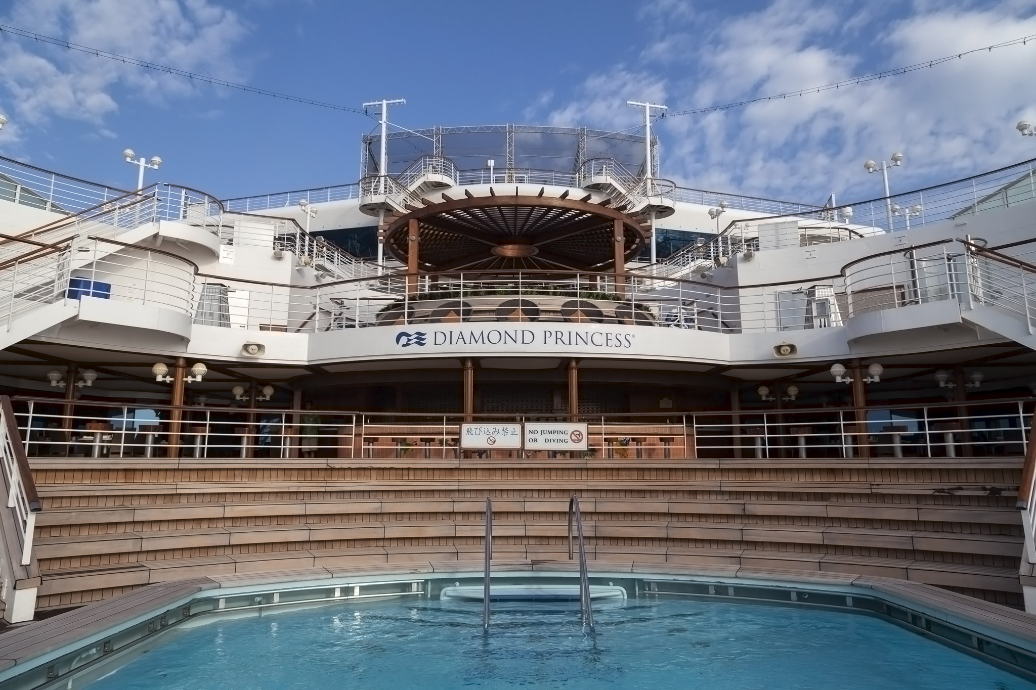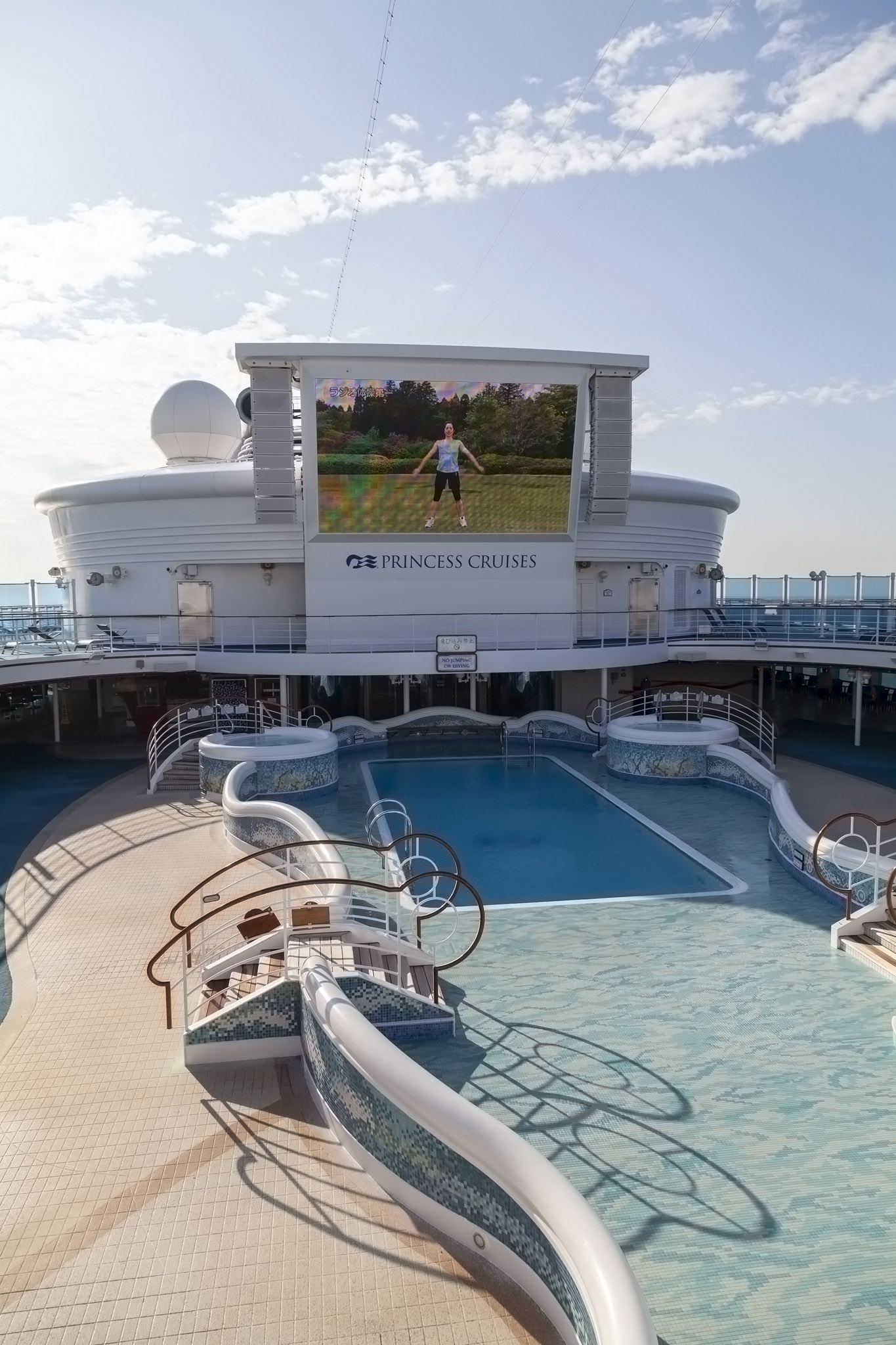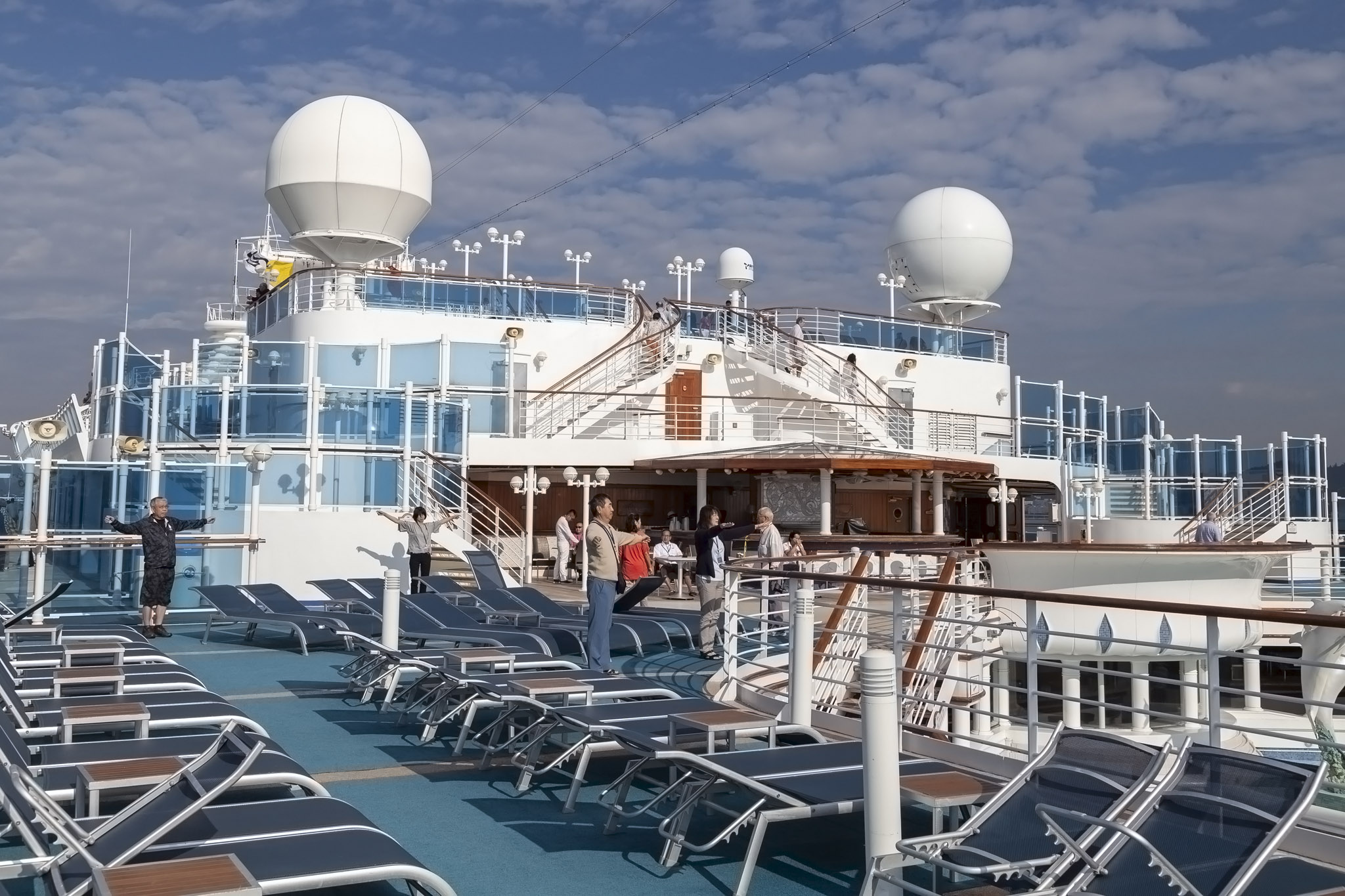 The daily Radio Taiso exercises were being shown on the movie screen out on the deck and there were – as usual – people joining in. We made a point to join in on sea days only so contented ourselves with simply observing for a while as Diamond Princess got closer to the Chinese city.