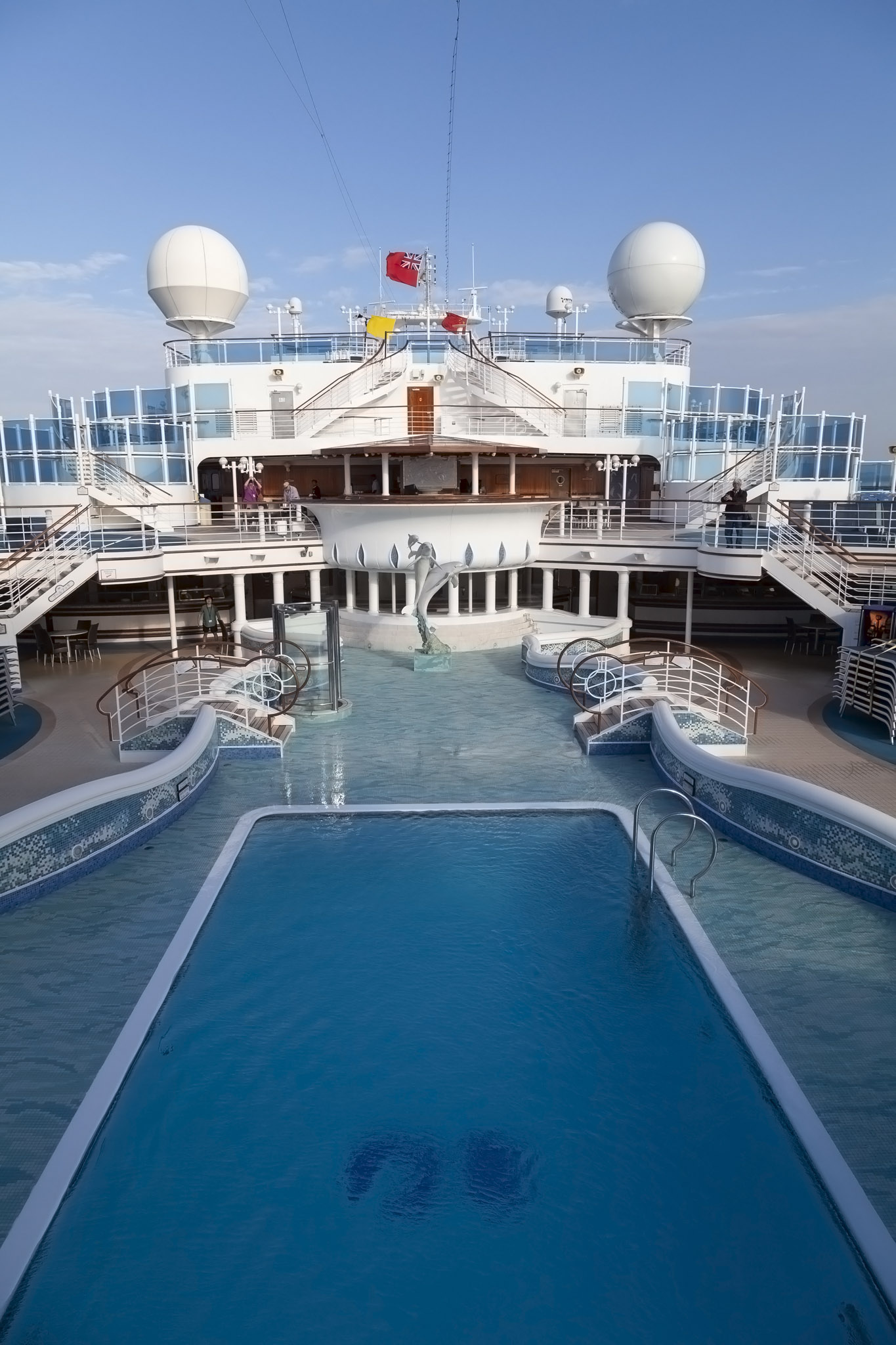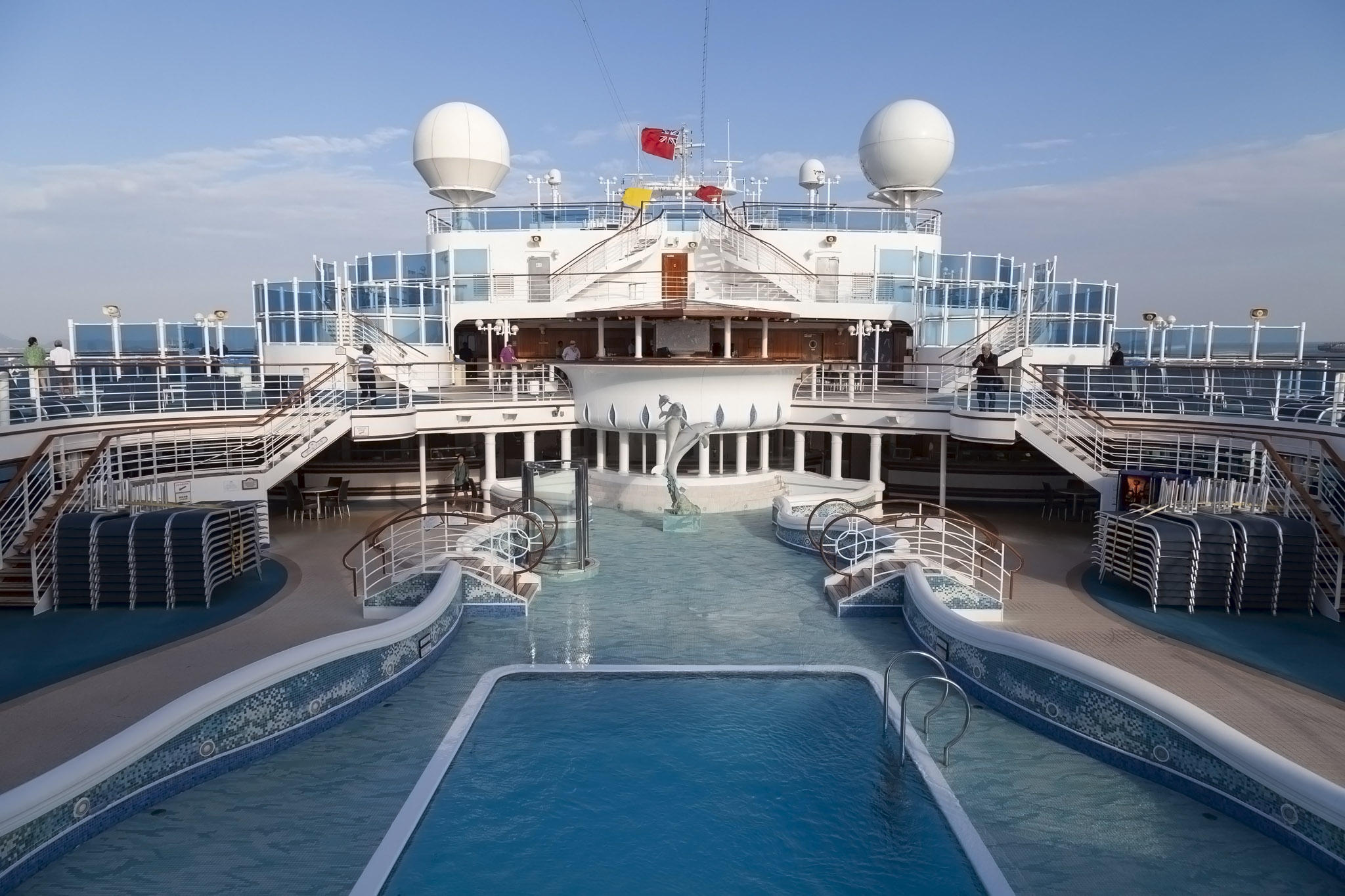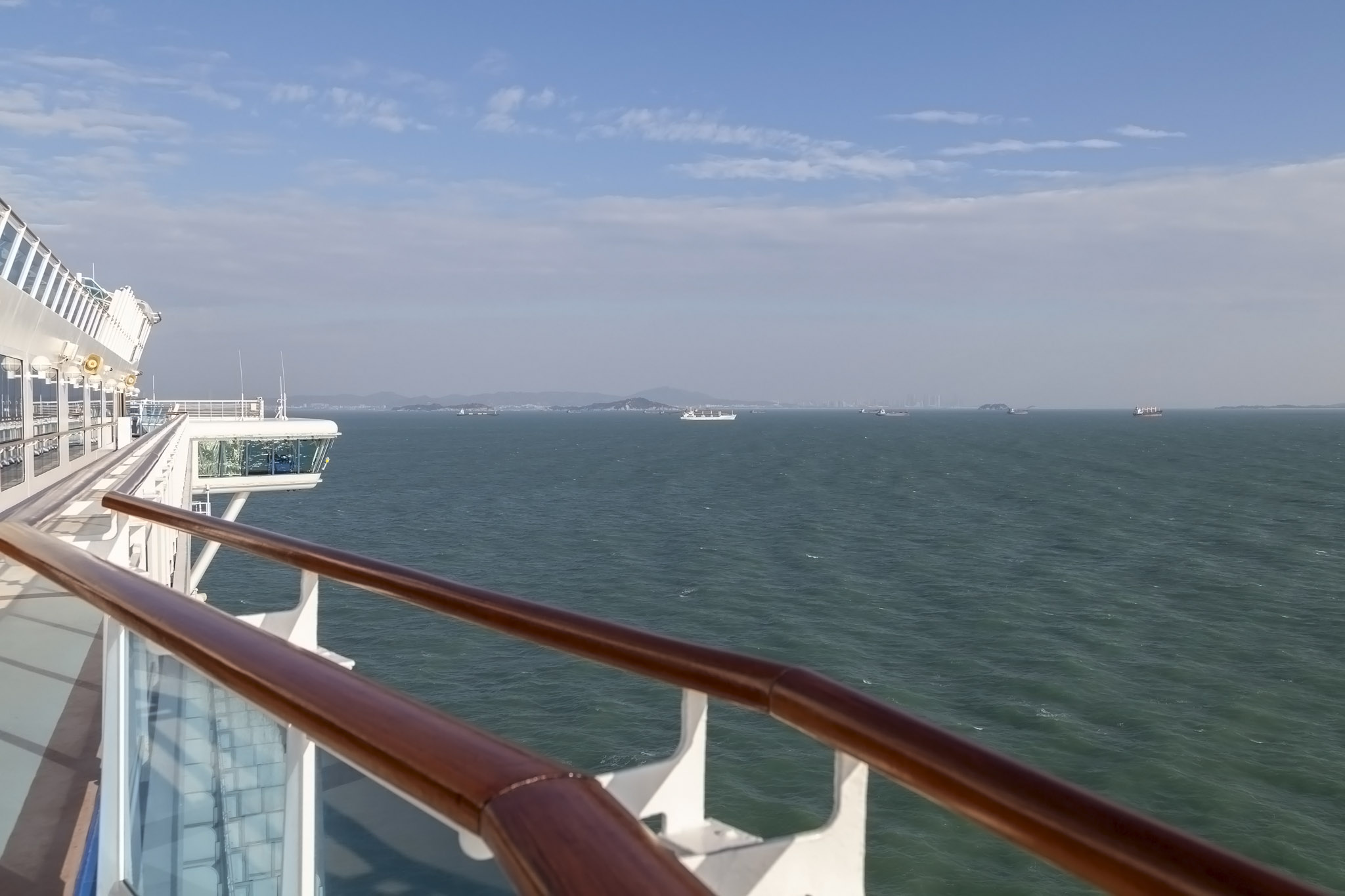 It wasn’t at all surprising to see the main swimming pool devoid of any people braving its frigid temperatures especially once we started to move from the open sea, passing Zhangzhou harbour on the port side and starting to follow the curve of Xiamen island clockwise. This had the effect of funnelling a pretty nippy north wind down the length of the ship which you’ll be able to hear in the video at the end of this post.