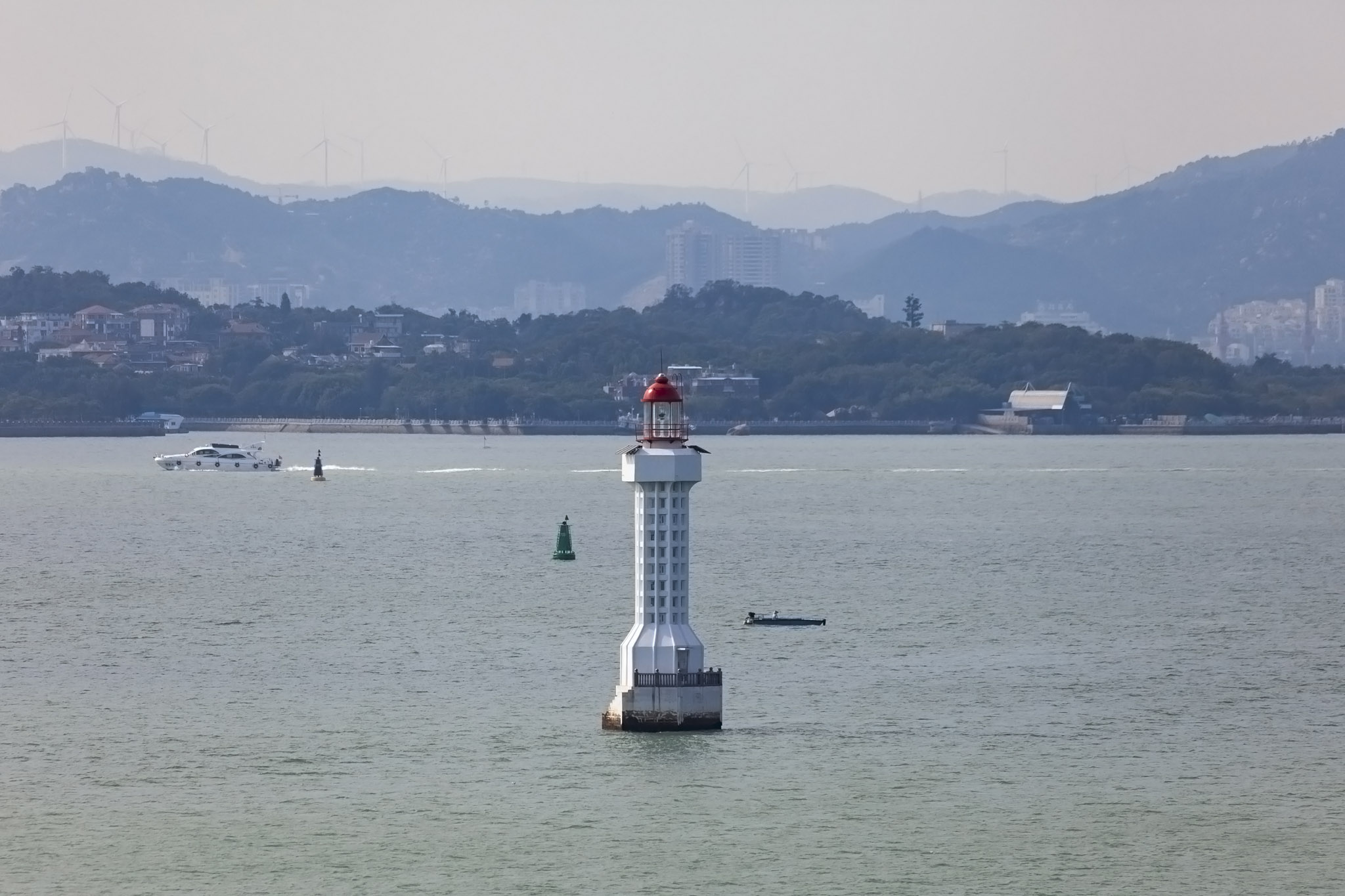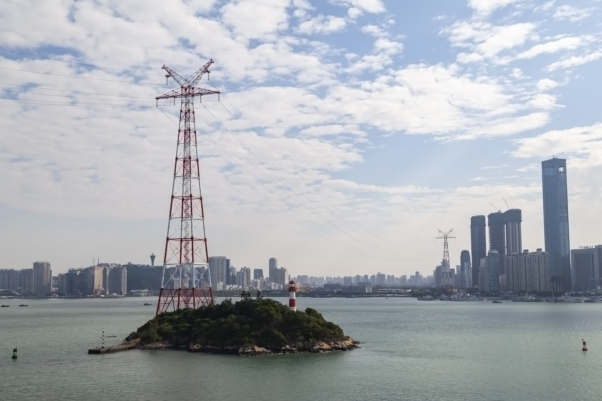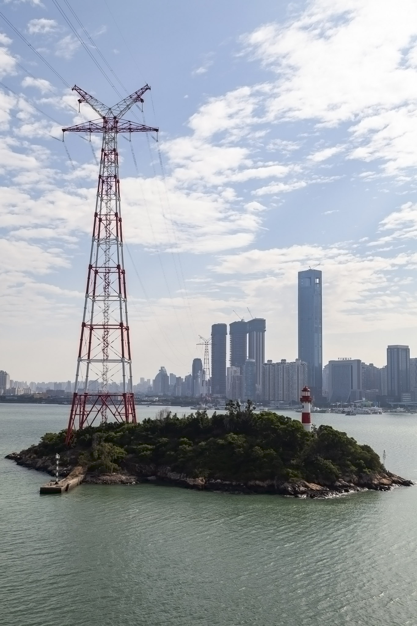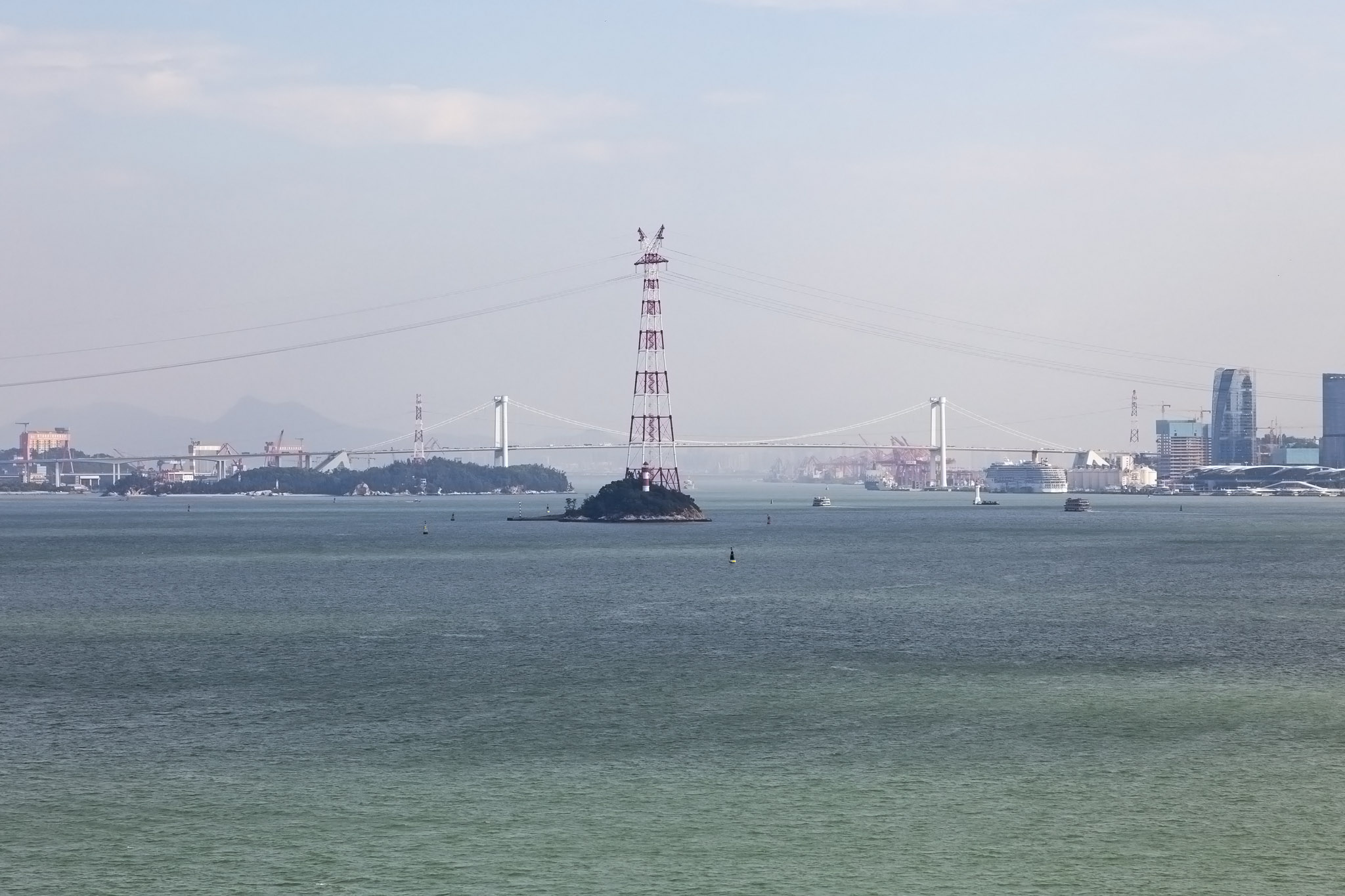 After Gulangyu we then carried on through the deeper water of the channel between the island of Dayu on the port side and a smaller island on the starboard where a pylon spanning the channel between the island of Xiamen and the Chinese mainland and a lighthouse were situated.