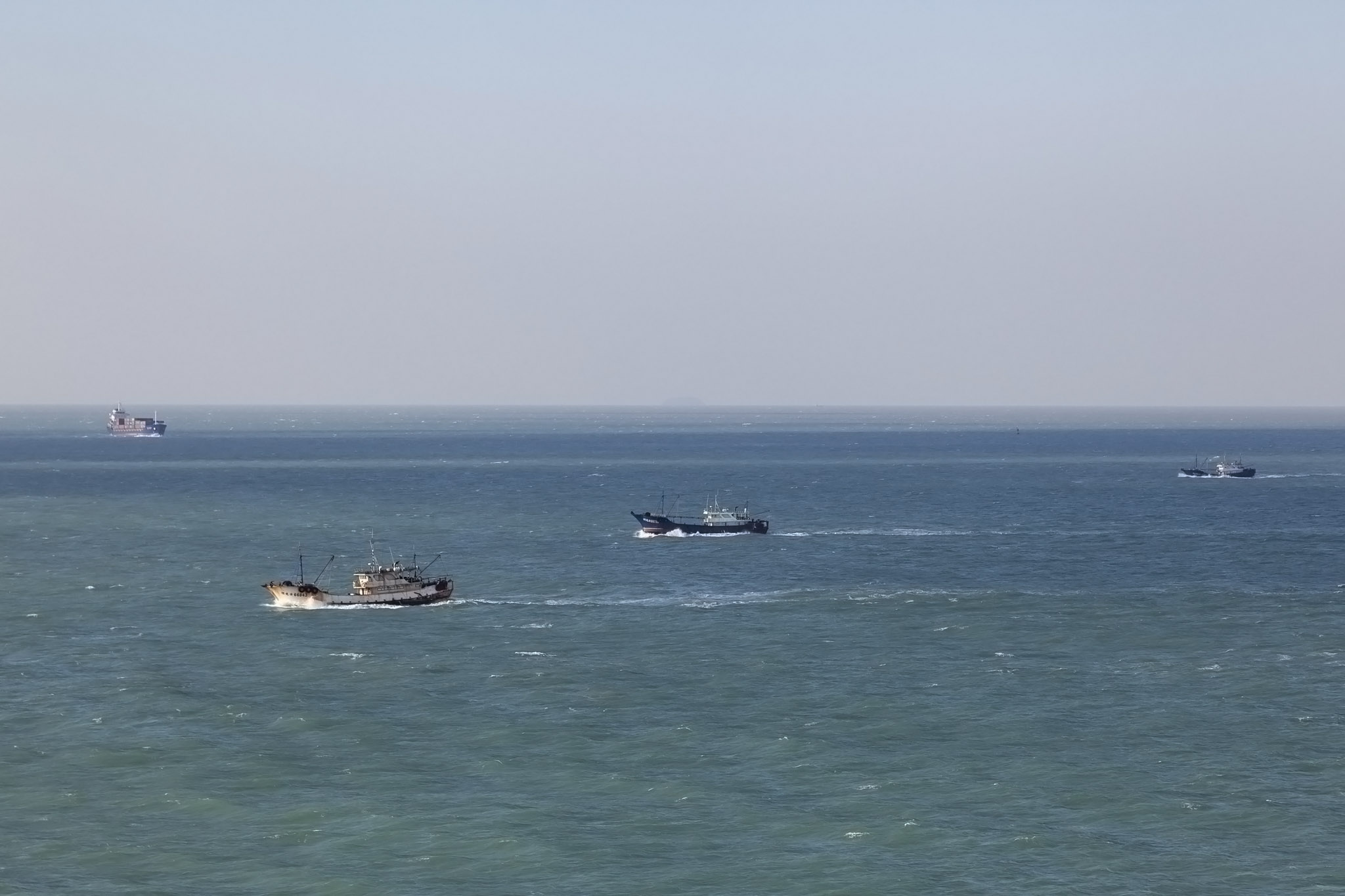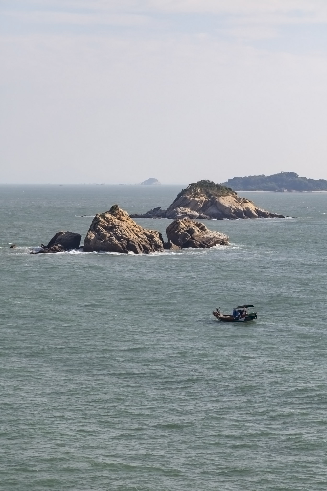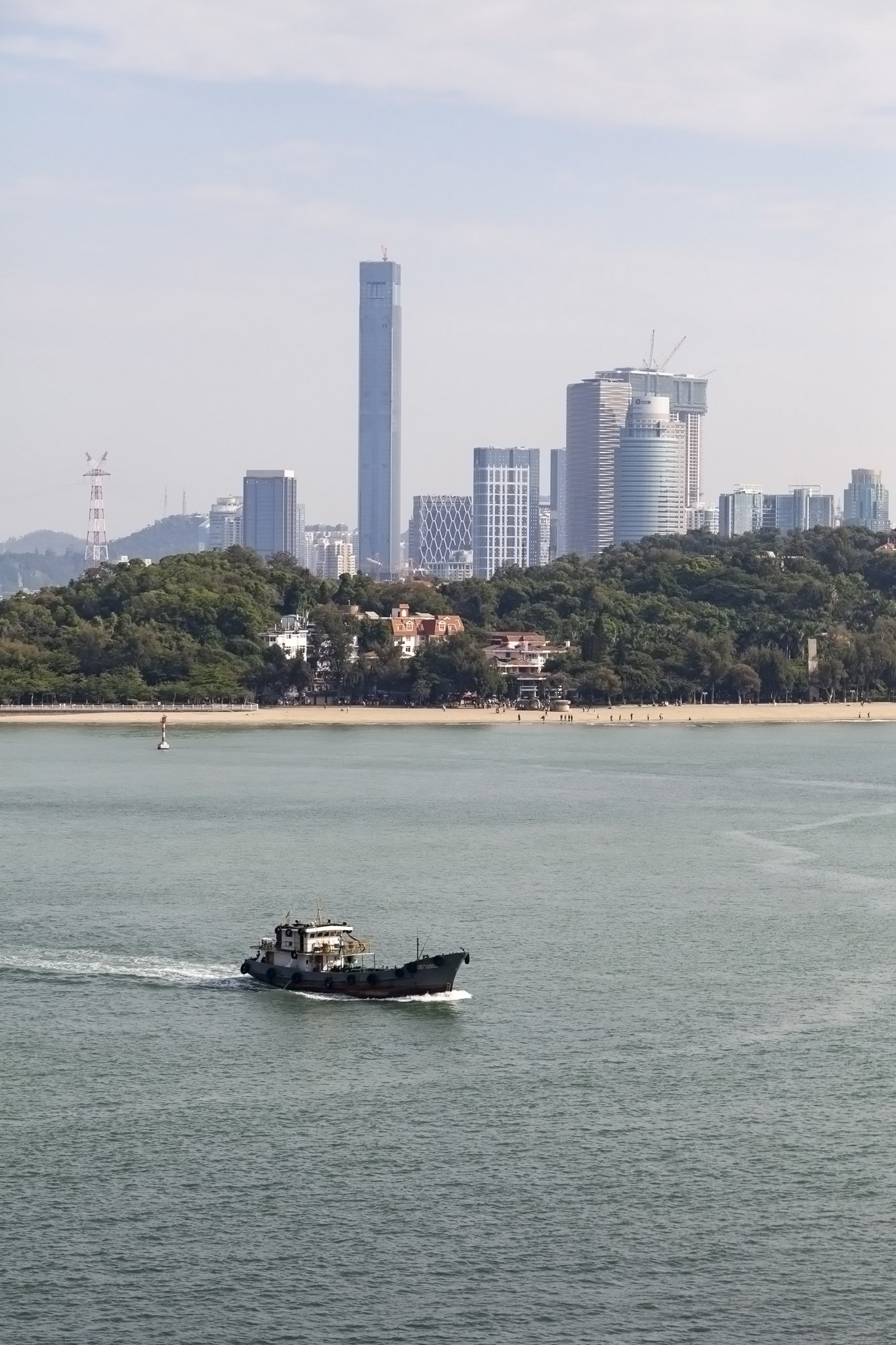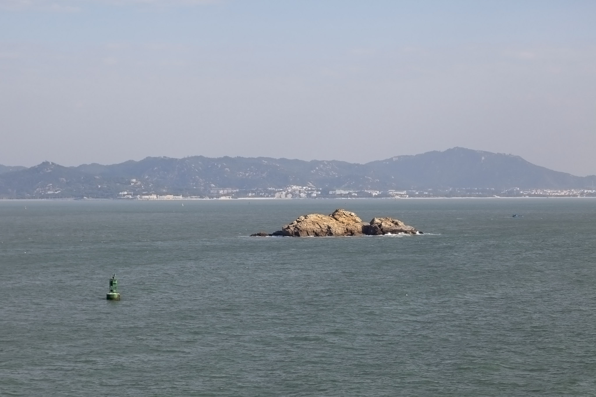 After Gulangyu we then carried on through the deeper water of the channel between the island of Dayu on the port side and a smaller island on the starboard where a pylon spanning the channel between the island of Xiamen and the Chinese mainland and a lighthouse were situated.