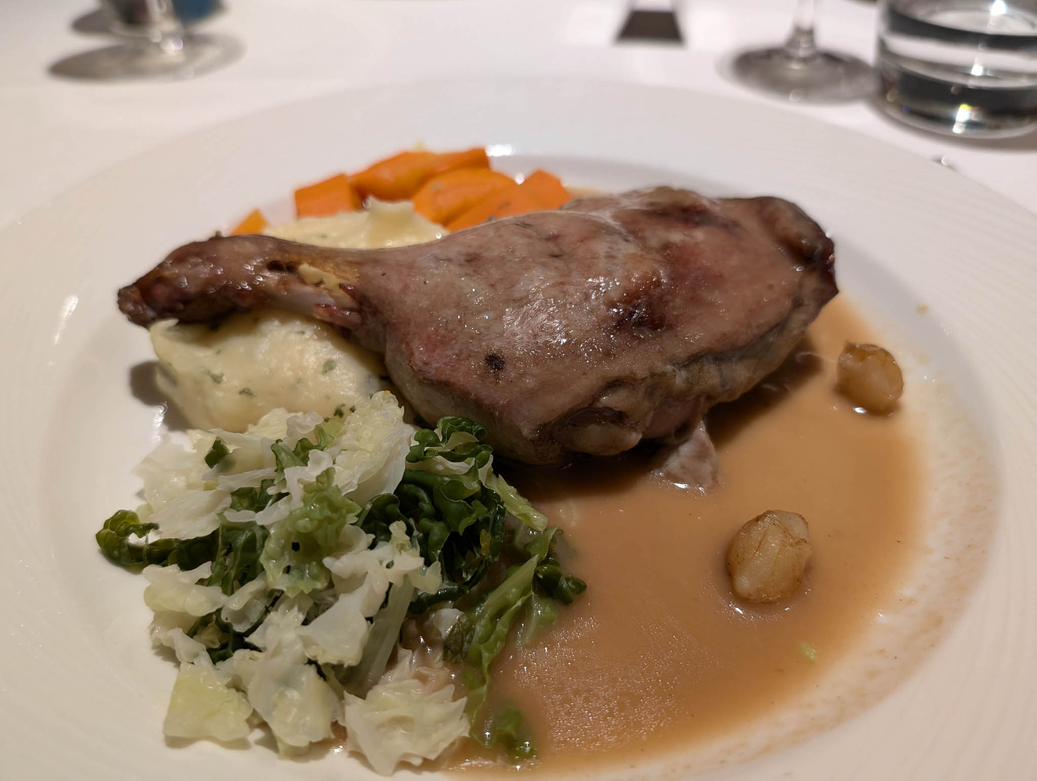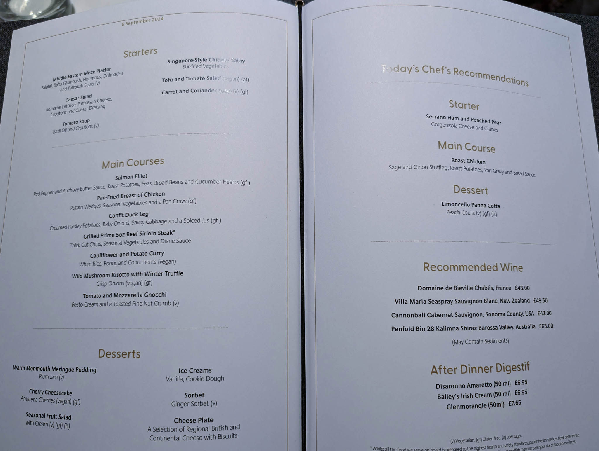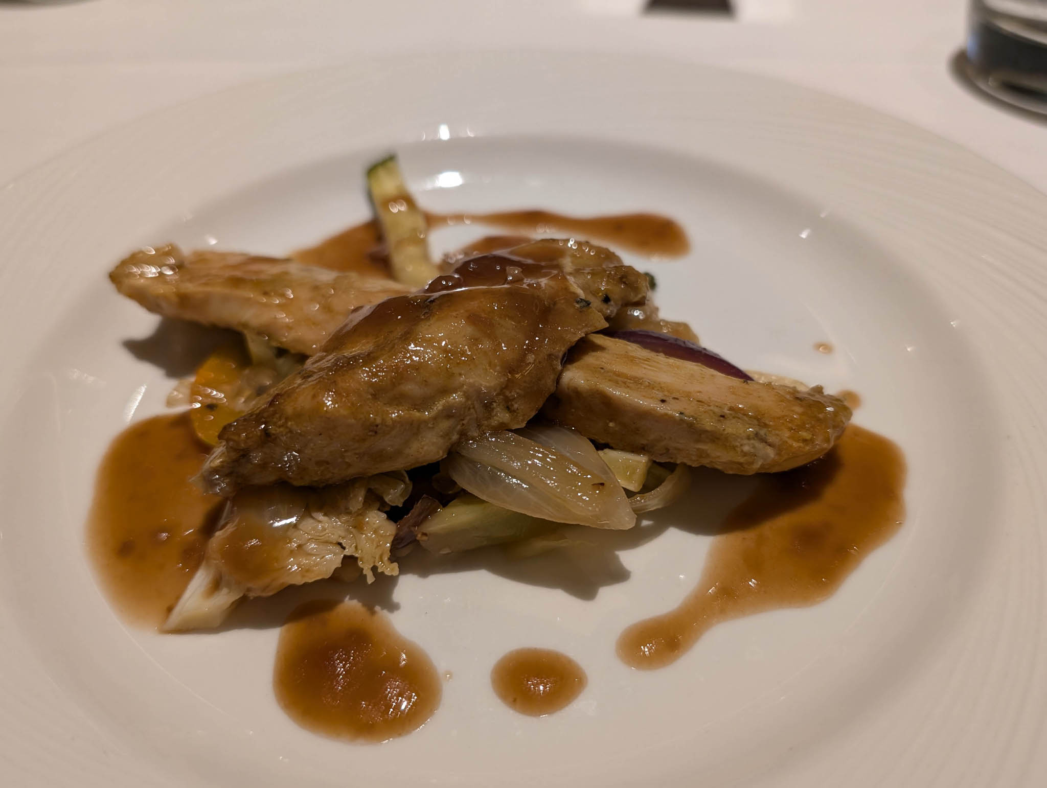The evening aboard Ventura as we headed northwards was much like any other, involving food and drink and musical entertainment. The dinner we had in the main dining room that evening is below for fans of photos of plates of food.