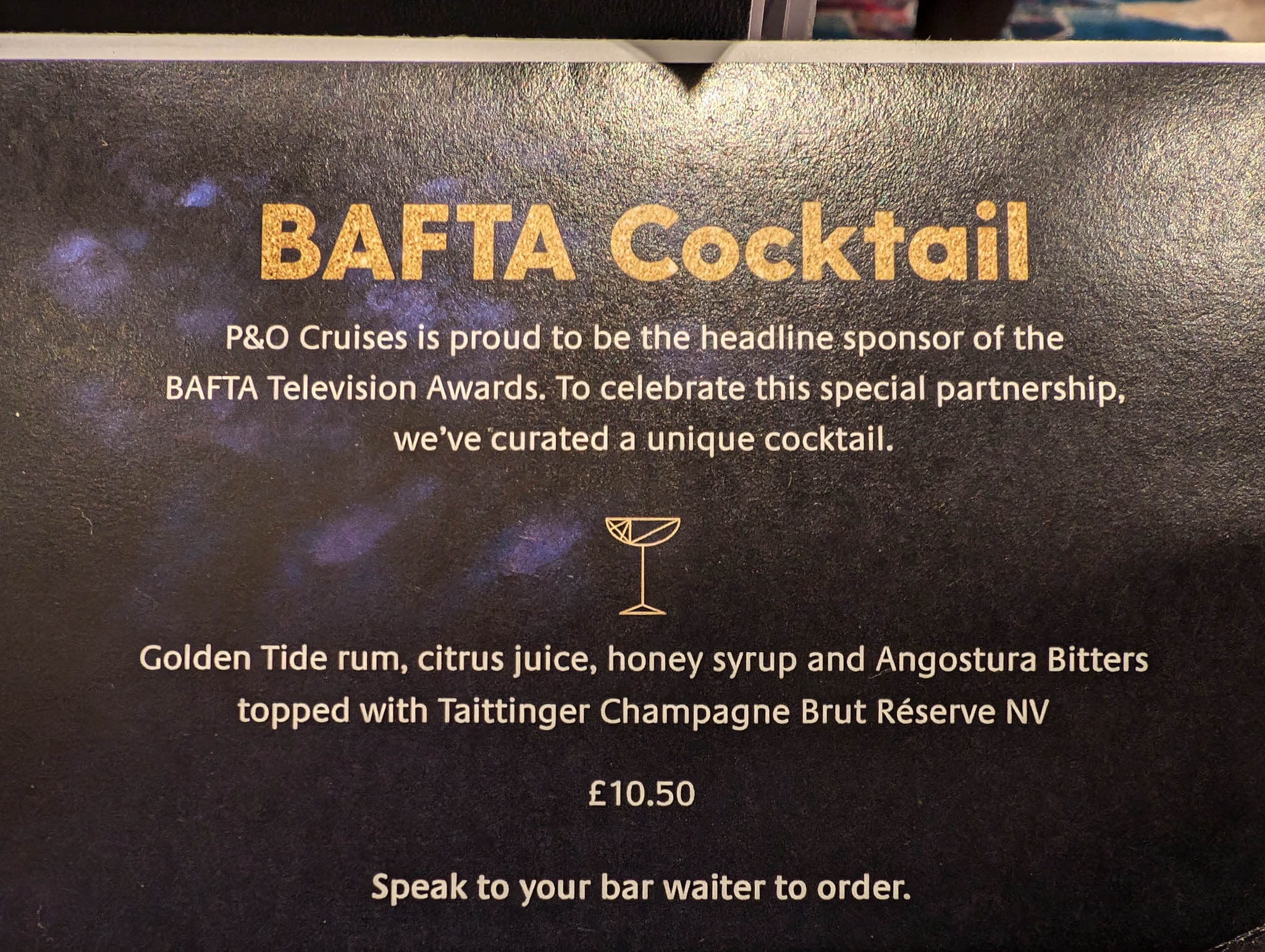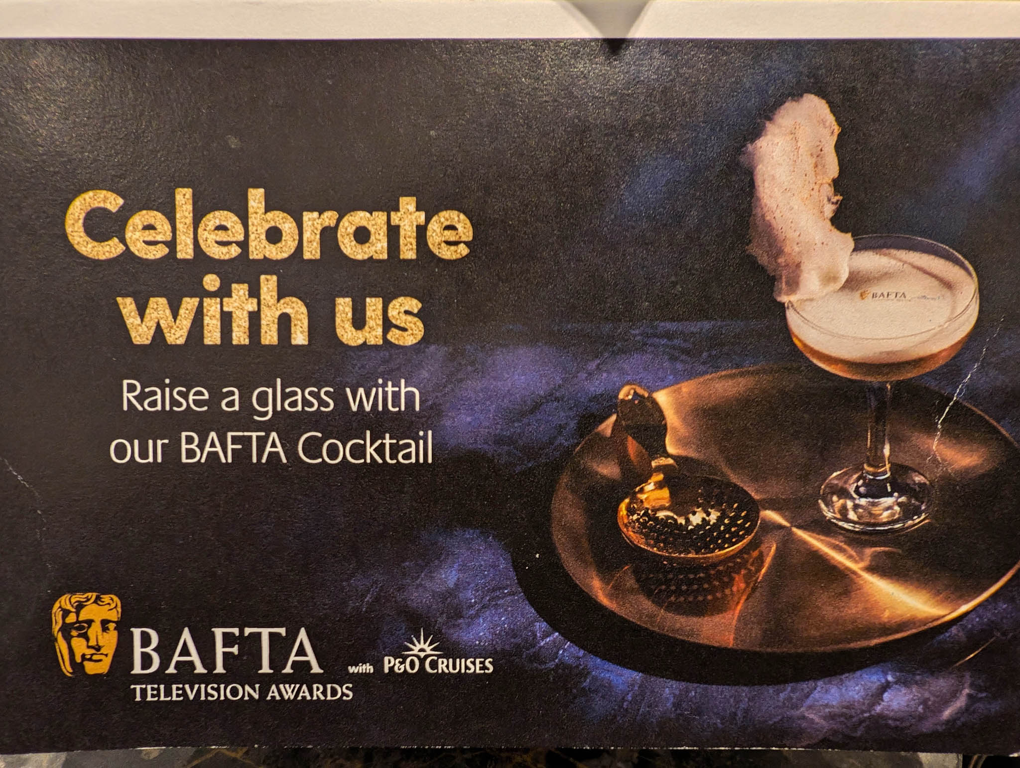 P&O Cruises were sponsoring the BAFTA Film Awards and as part of the promotion around this event they were showcasing a special cocktail for the evening. I decided to splash out and try one and… it was okay. The cocktail ingredients were helpfully provided should you wish to try to make one yourself and see what you think of it.