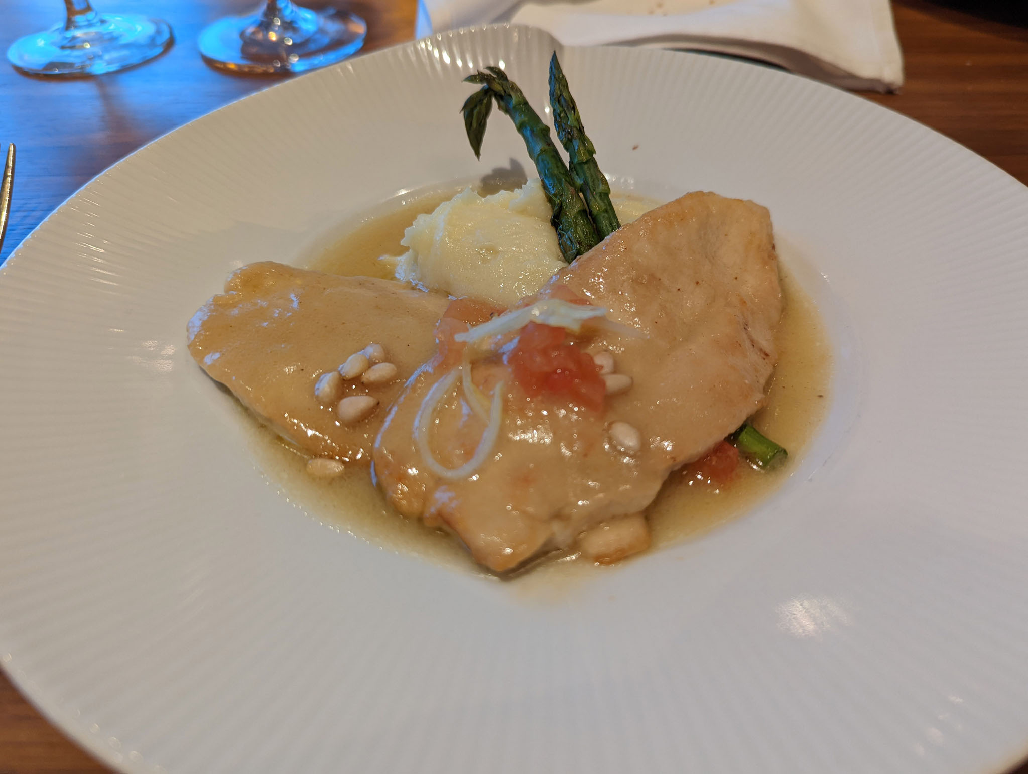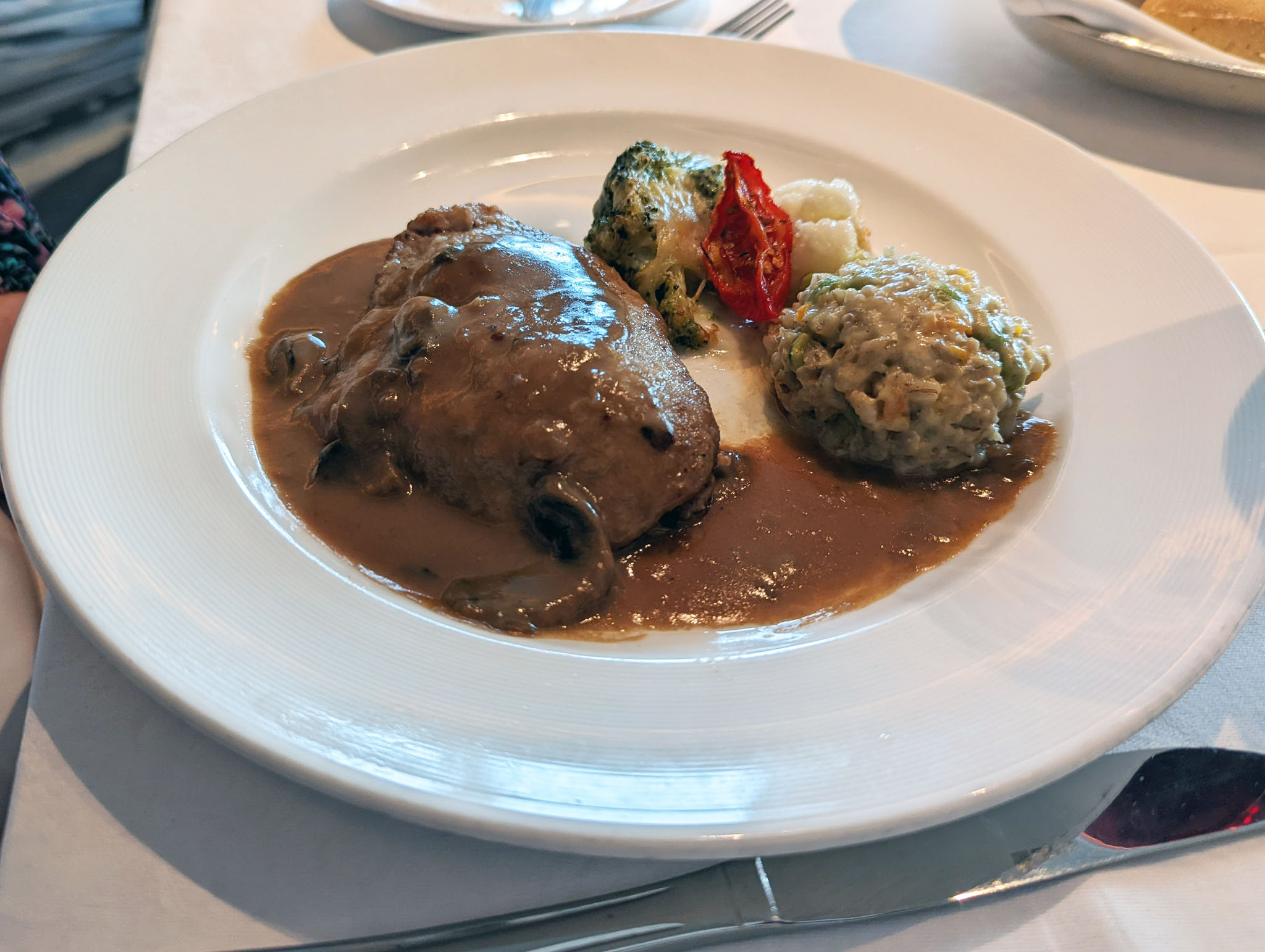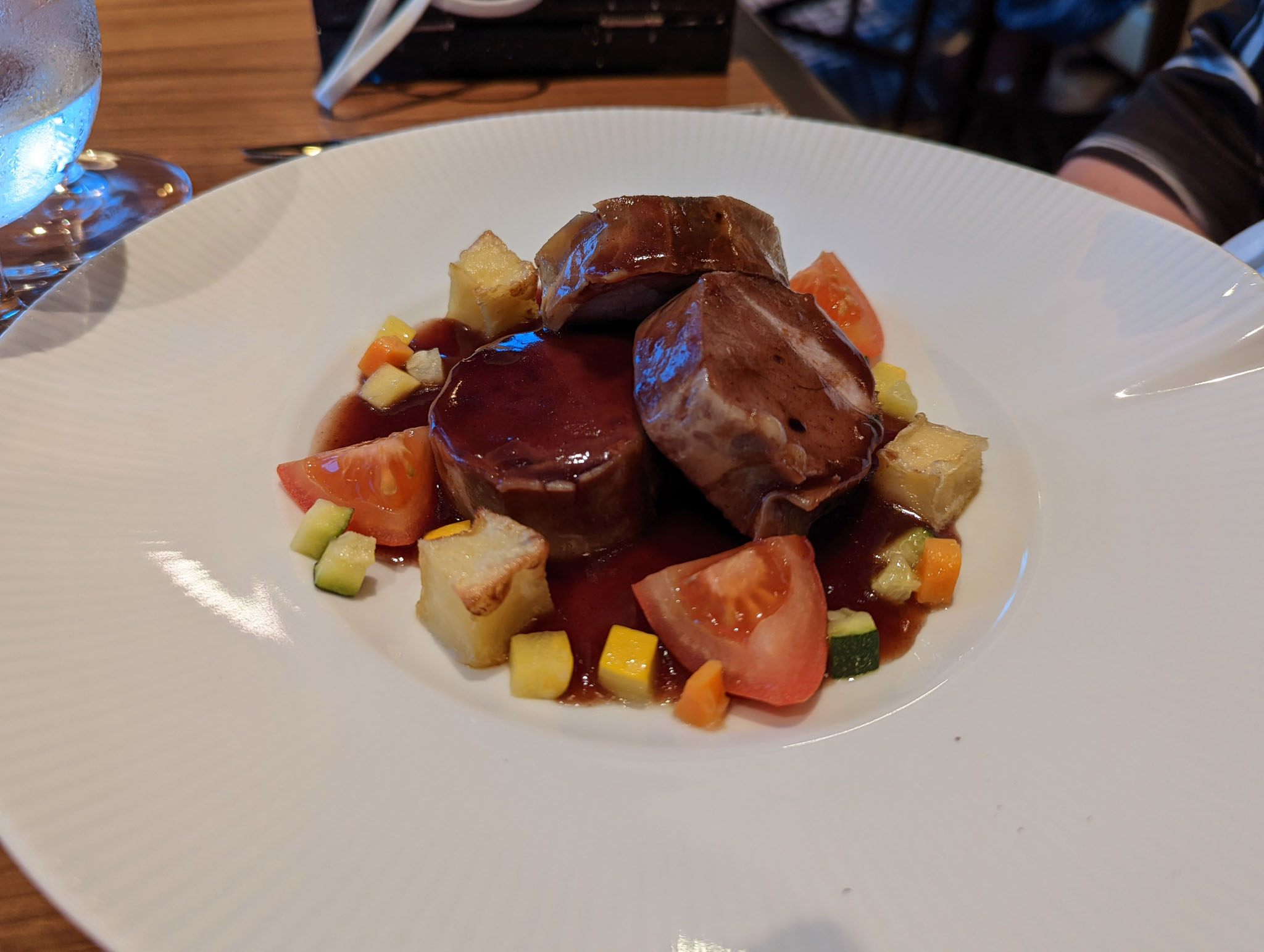 Now here are examples of the food we ate in the main dining room on Sky Princess (that’s the MDR to regular cruisers) and not only does it look great (to me), but it was great (to me). Don’t let that persuade you one way or the other, though, because you won’t be having the same chefs on the same ship on the same day, cooking in the same way, and presenting you with the same food as me unless you have access to one of those new-fangled personal temporal incursion devices that are all the rage. If they’re not all the rage when you’re reading this then oops, someone went and changed something in the past again.
