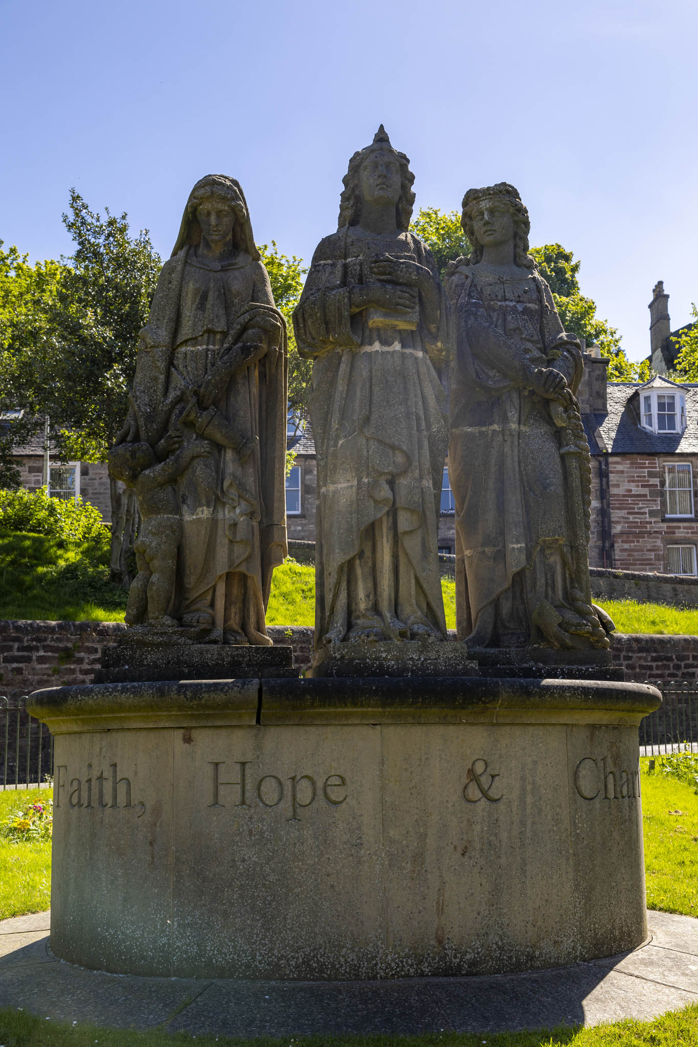 The statues of Faith, Hope, and Charity below used to grace the top of a store in the city centre but fell into private ownership hands when that building was demolished, only returning to public view to be mounted together along the bank of the River Ness in 2011.