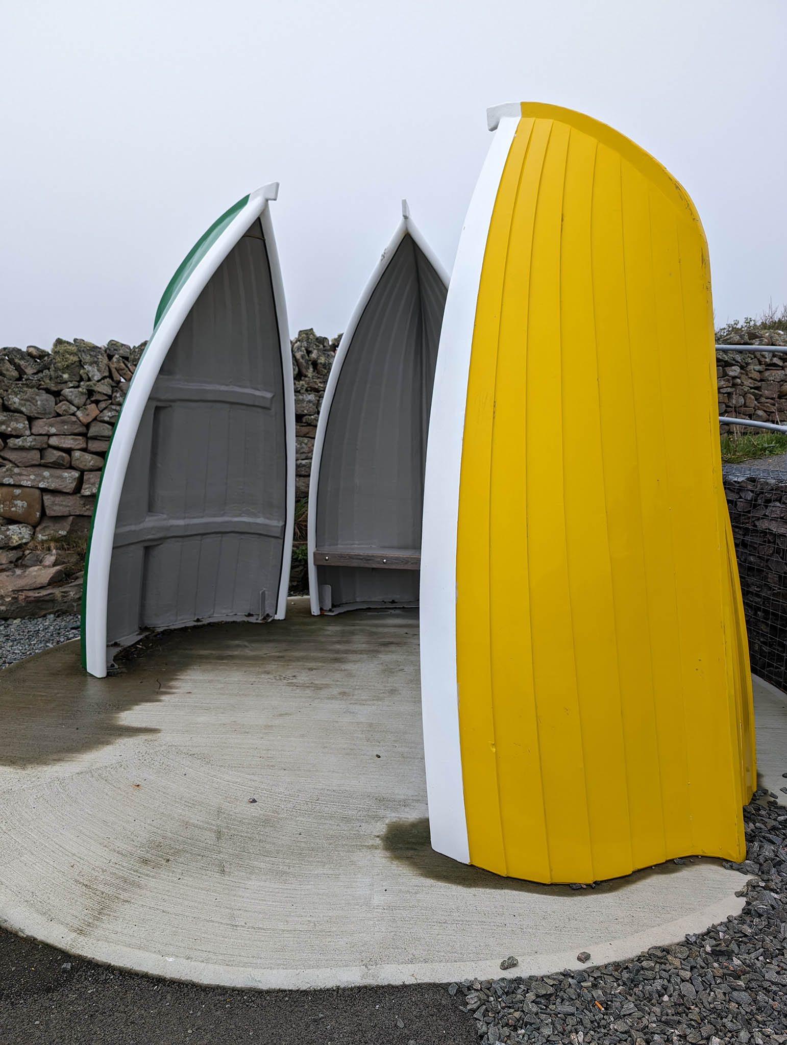 One final piece of functional artwork to spot before we made our way inland towards the loch were the shelters installed by NHS Scotland using brightly-coloured upright boat hulls. These were erected in 2023 to be used by the nearby staff and patients of the Lerwick health centre as well as tourists walking the path. And we did, even though it wasn’t raining, just because we could.
