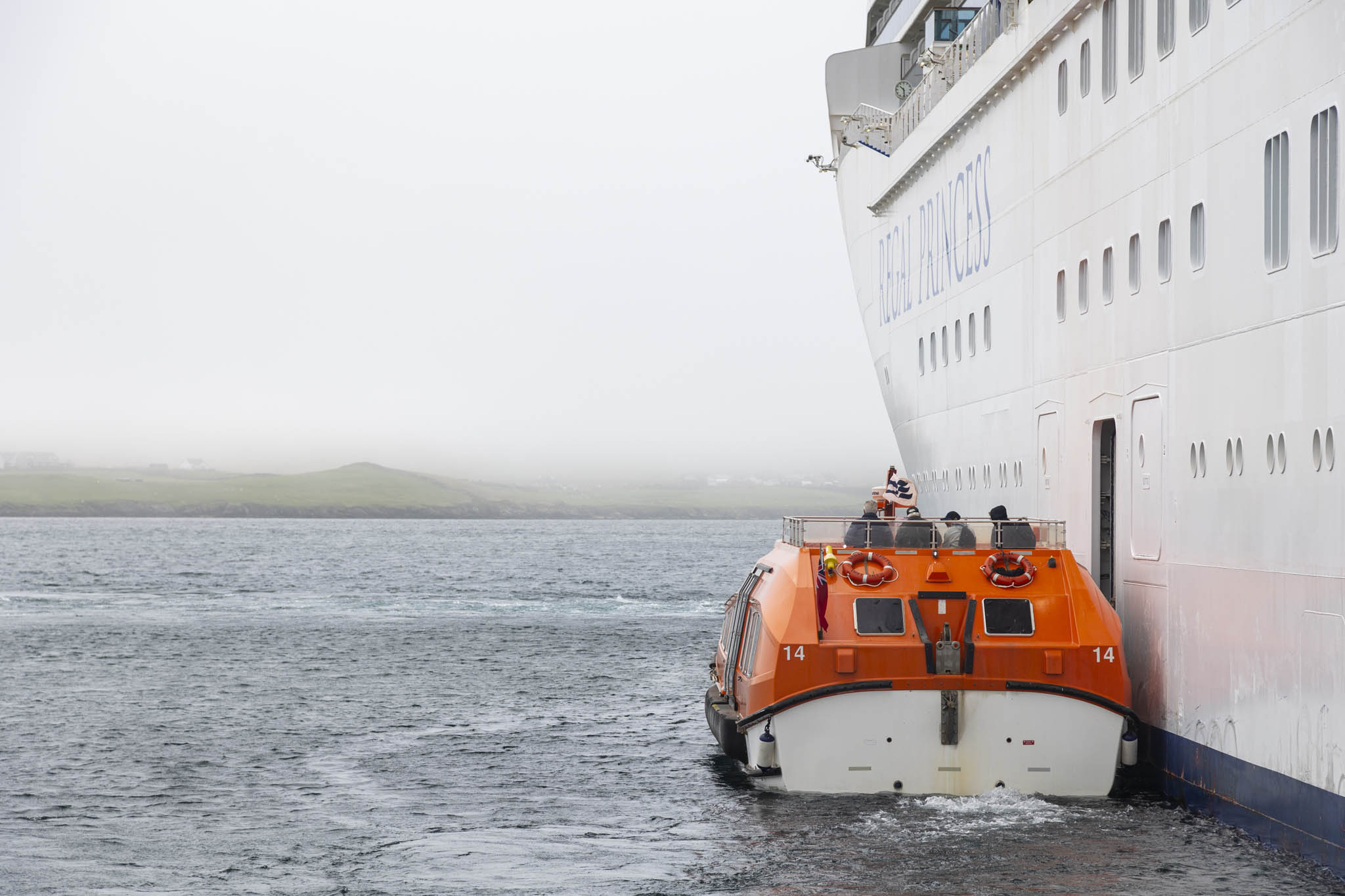 If the weather is nice then the first people to board a tender boat from a ship like to sit up top (if that’s an option). When it’s cold and damp then this isn’t the case, but there are still two good arguments for getting to the exposed part of the boat: firstly, you get fresh air and views without being shoulder-to-shoulder with strangers on decidedly uncomfortable benches with, if you’re lucky, a misted-up, water-splattered porthole to look out; secondly, you get off the tender boat first when it arrives at its destination. While my wife opted to sit inside for both trips between Lerwick and Regal Princess, I went for the chilly option.