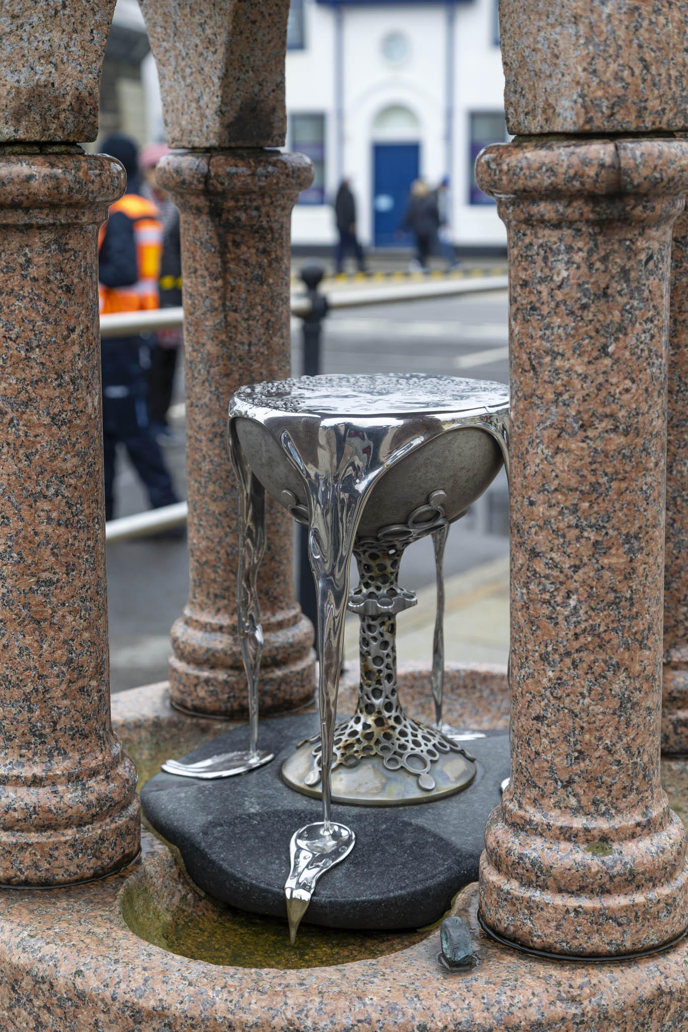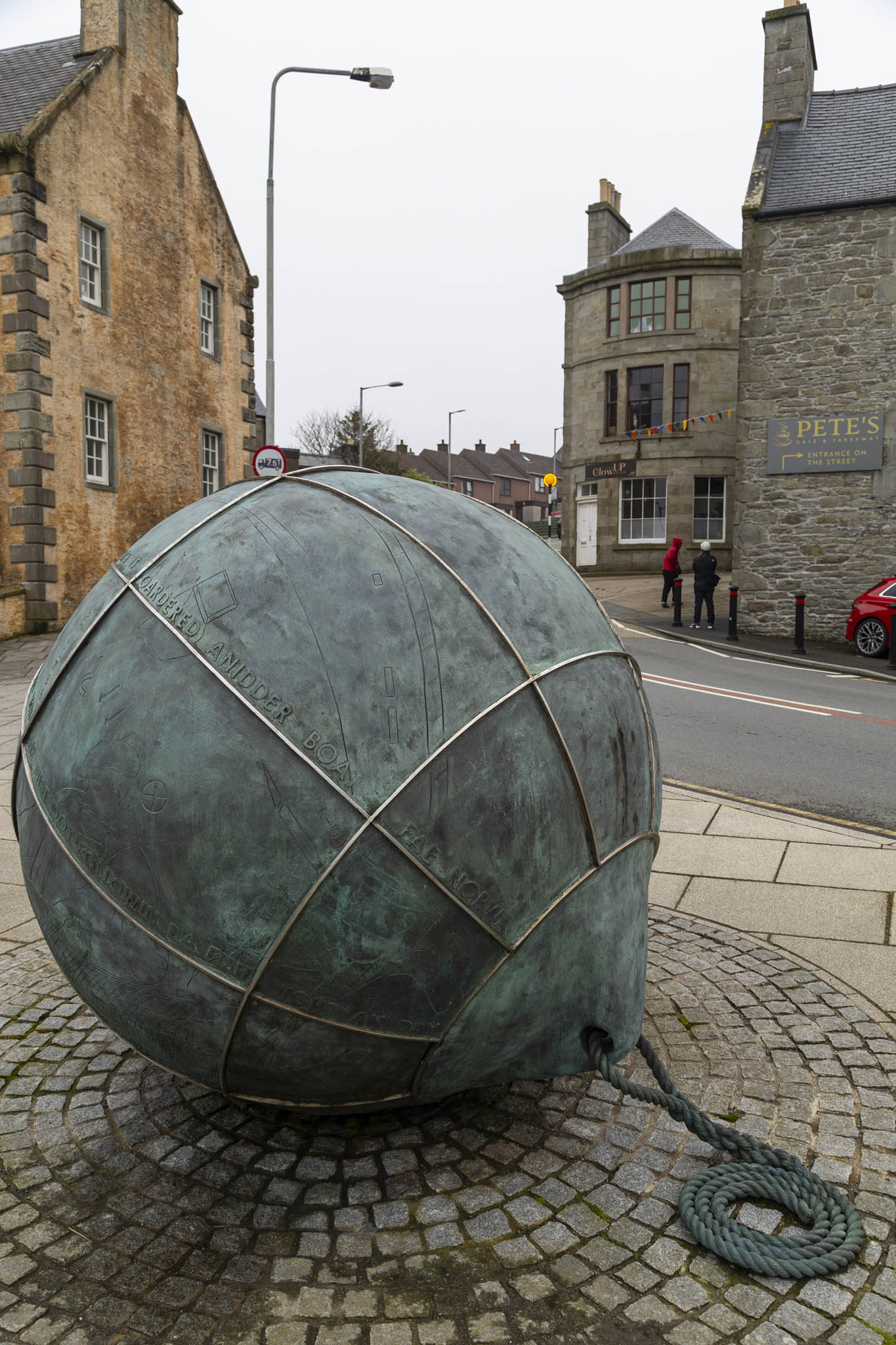 Being first off the tender boat I had time to hang around and snap some shots by the pier at Lerwick until my wife emerged from her shelter. An interesting sculpture caught my eye – they often do – and this turned out to be the Diana Fountain. No, thankfully, not a memorial to the late princess, but rather one erected in 1890 for the whaling ship Diana which became trapped in Arctic ice for six months in 1866 leading to many deaths. The original water fountain was replaced by the overflowing metal chalice sculpture in 2000 by local artist Alan Hart.