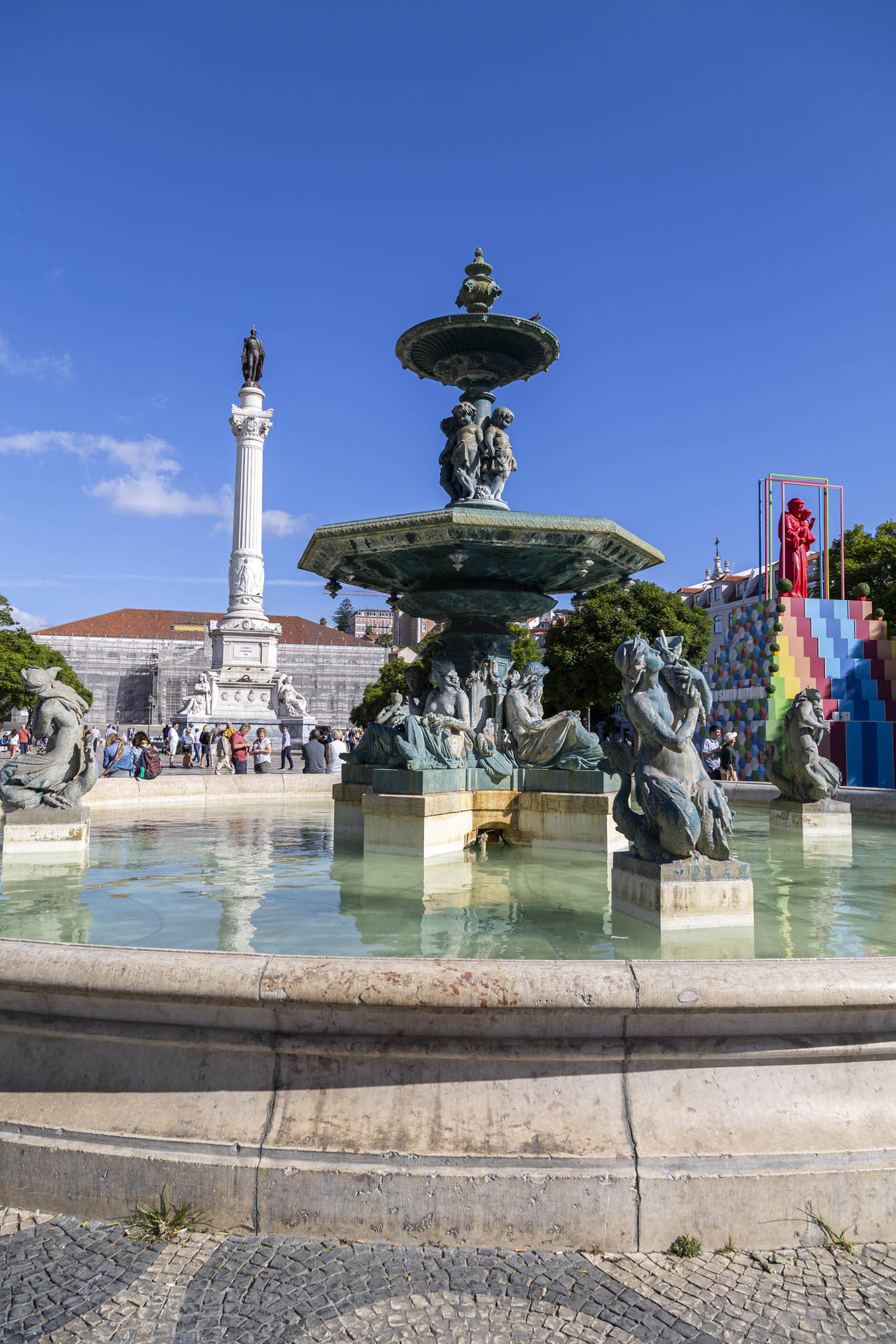 Praça Dom Pedro IV (or Rossio) was just a short walk from where we’d got off the bus and it had a lovely example of that tiled ground that Lisbon loves. I quite liked it too although my wife said that staring at the wavy black and white pattern made her feel ill. You wouldn’t think that would be the case for someone used to cruising but there you go. The square’s column, paving, and two bronze Baroque fountains from France all date to the nineteenth century although the square was in use long before that and had undergone significant rebuilding a century earlier following the 1755 earthquake that had such an impact on Lisbon.