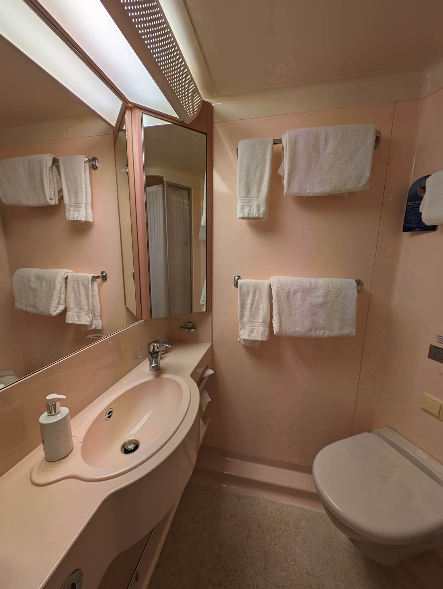 The cabin on Aurora was a good size with largely standard layout. With Aurora being an older ship she had a little more metal around the balcony area than you tend to find on more modern vessels that utilise more lightweight materials and more gaps to cut down on weight, but we quite like that additional bit of privacy from your cruising neighbours. Balcony depth was reasonable, especially compared to newer ships too. The bathroom was perfectly adequate if a little dated in its colour, but nobody ever had an unsatisfactory wash because the walls were tinted salmon pink.