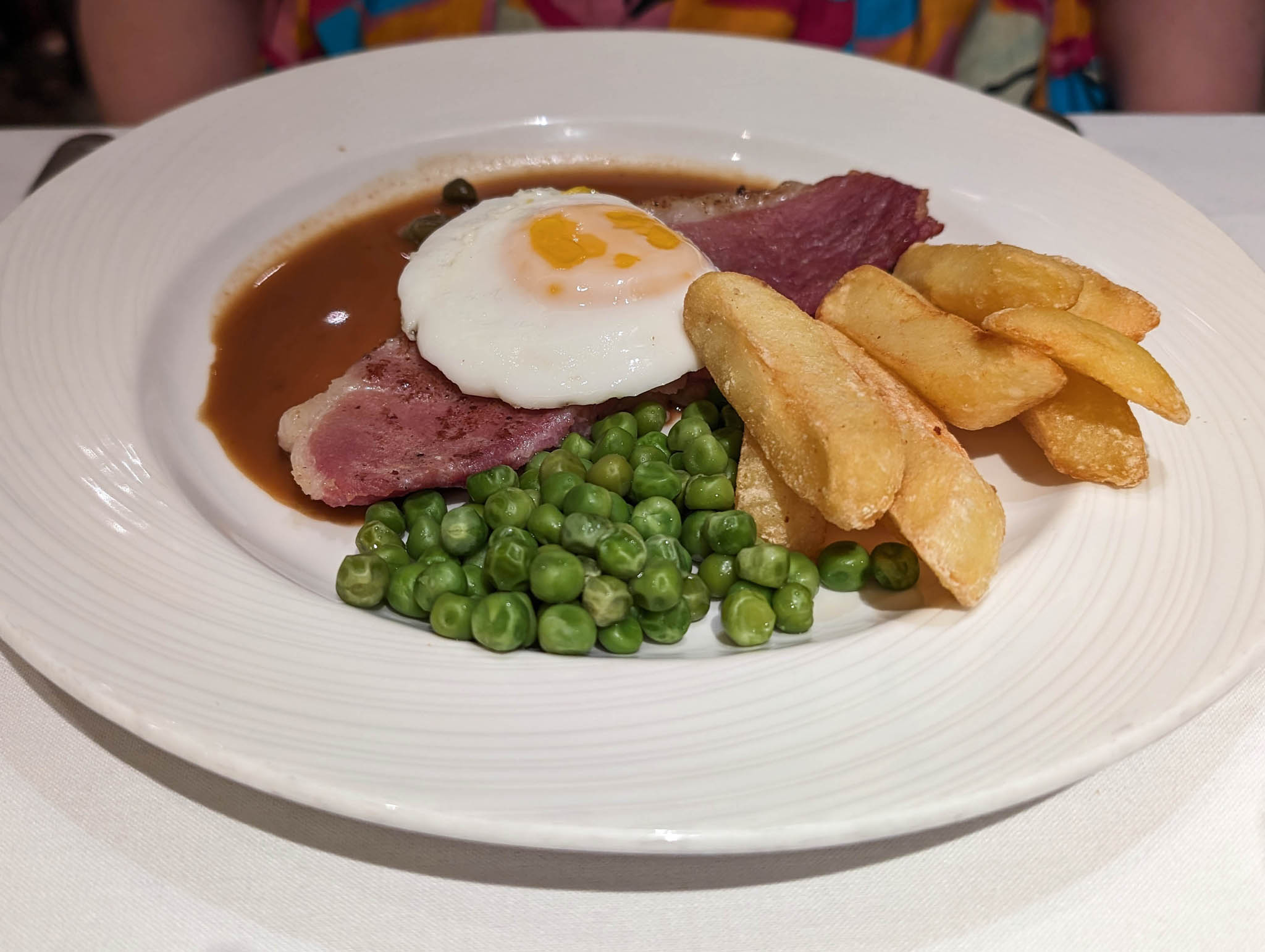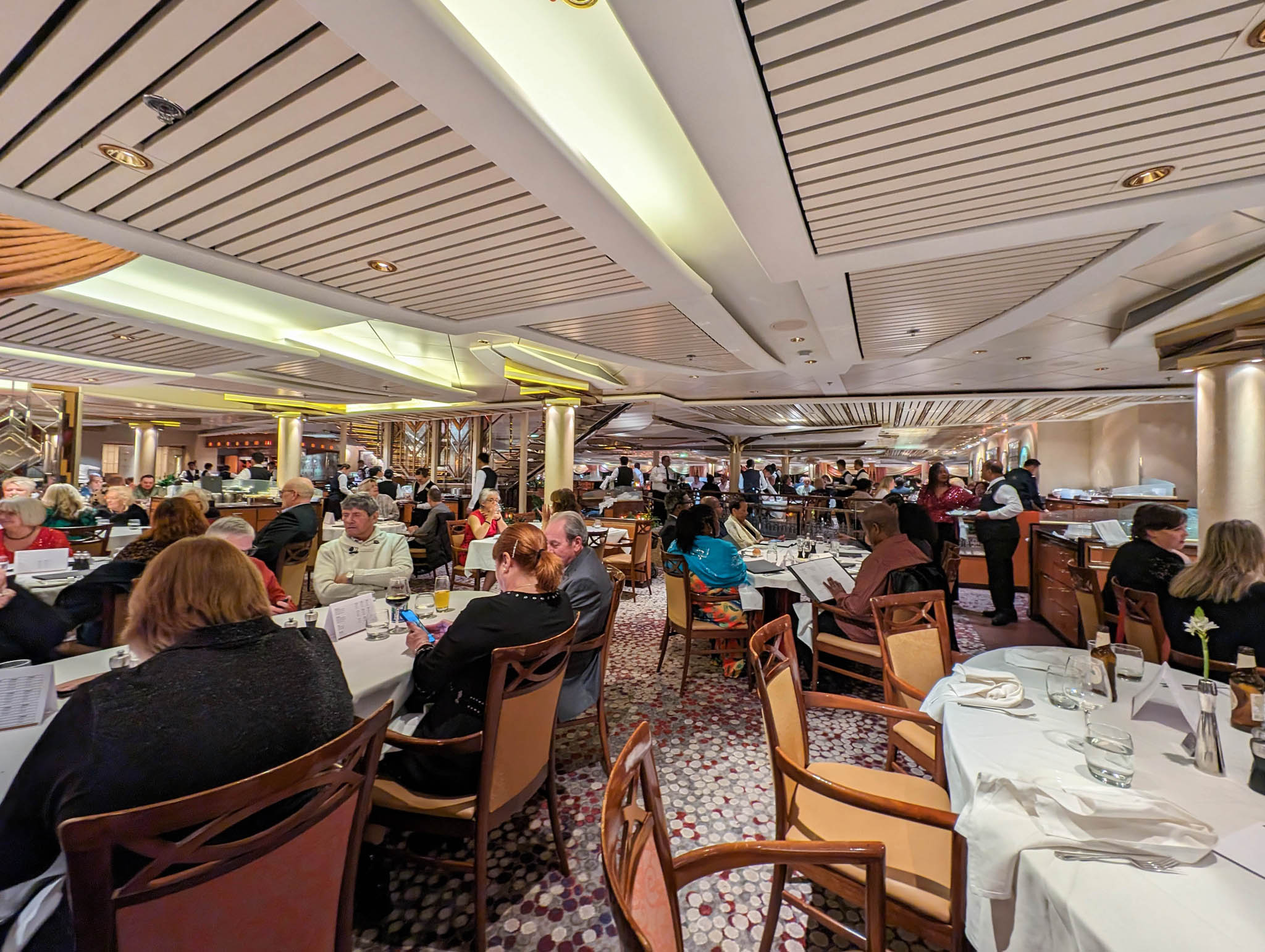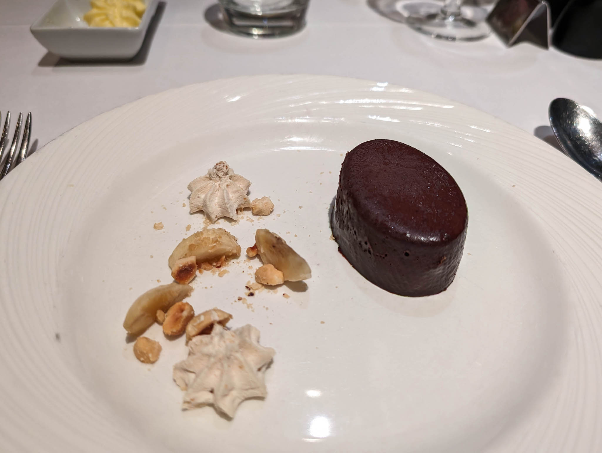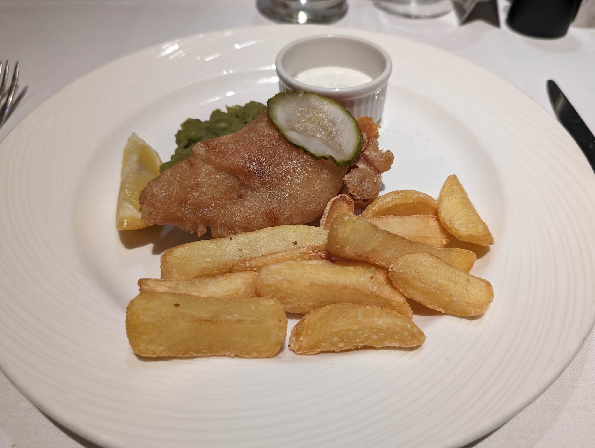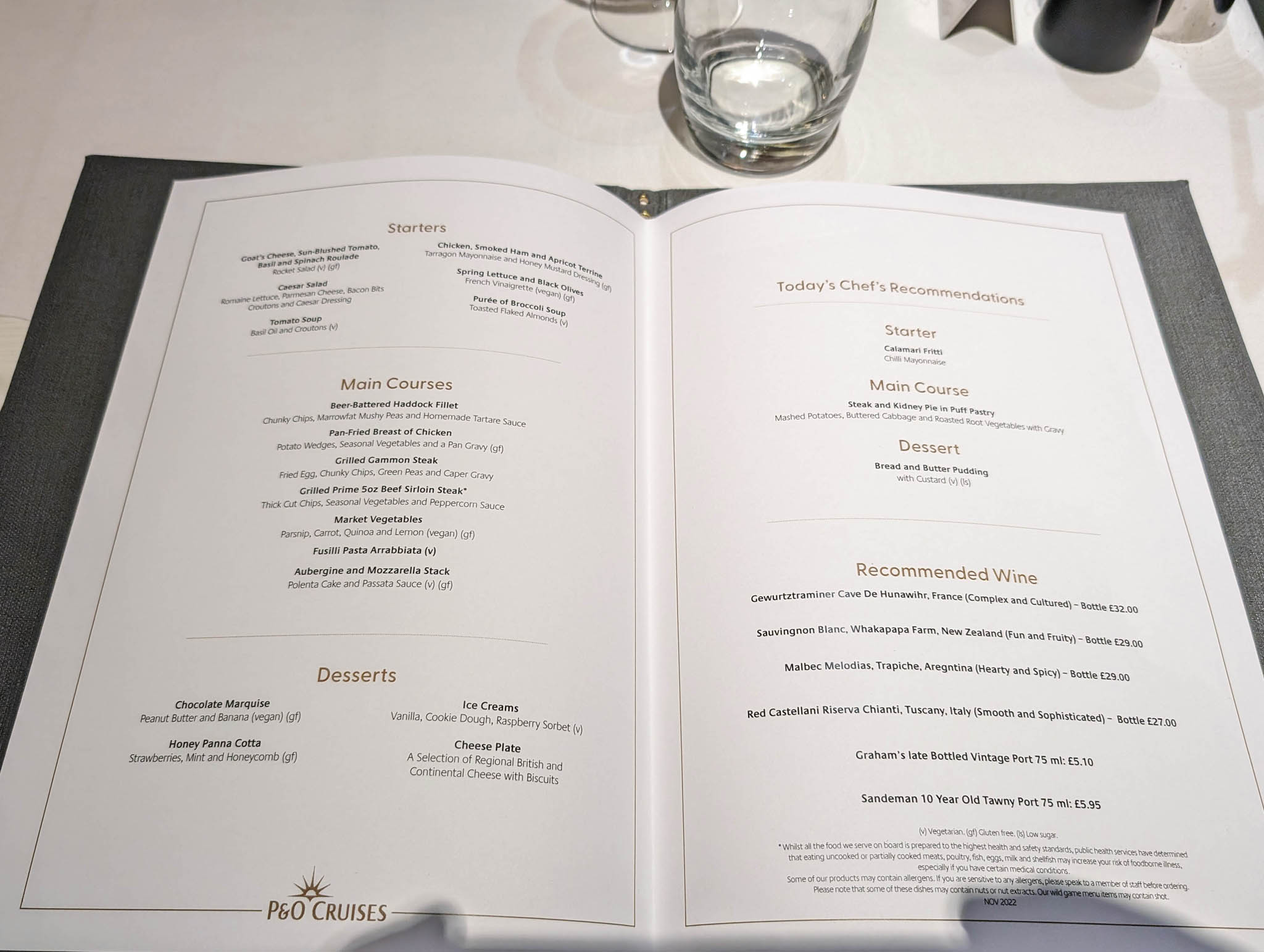 So, that brought our time in the Netherlands aboard Aurora to an end. Some photos of the final evening meal on the cruise because, as I’ve mentioned, there are people who like to see these things. This was our only time in the main dining room on this short cruise. It wasn’t the best of meals. We’d encountered a surly attitude from the staff before getting to our table because we didn’t want to share on a table for eight, then we’d had some pretty dismal service during the meal too with food delivered perfunctorily and no offer to top up our water.