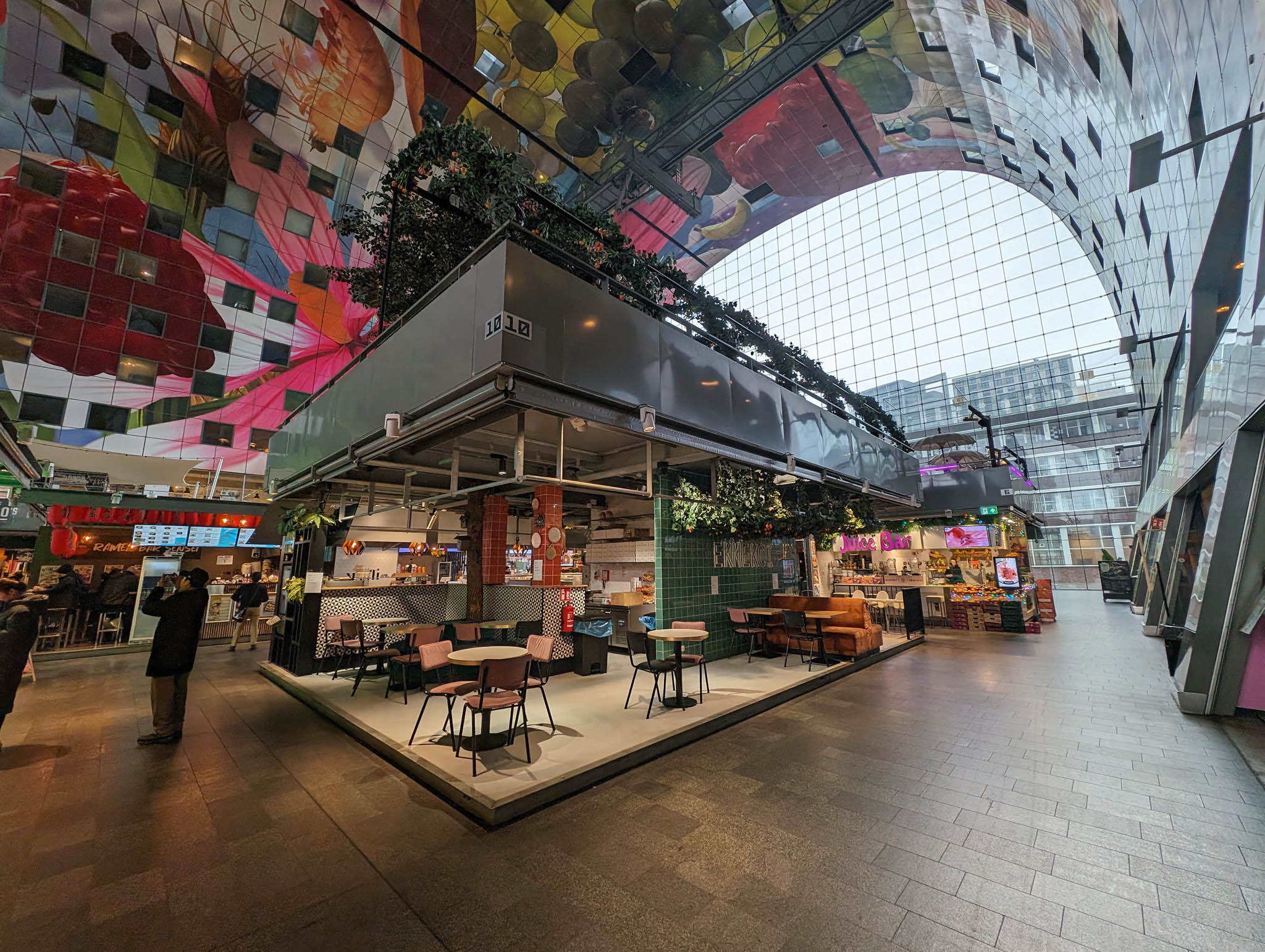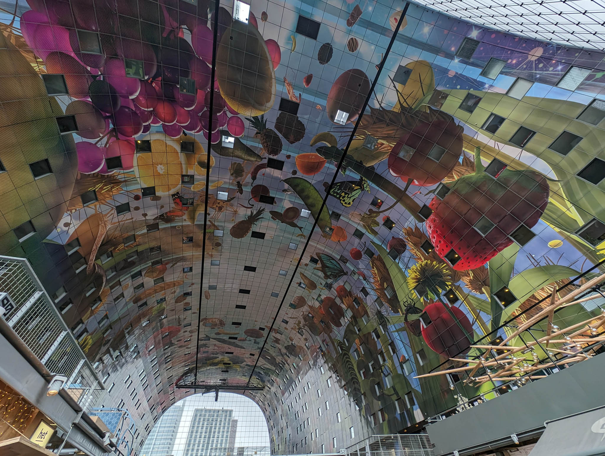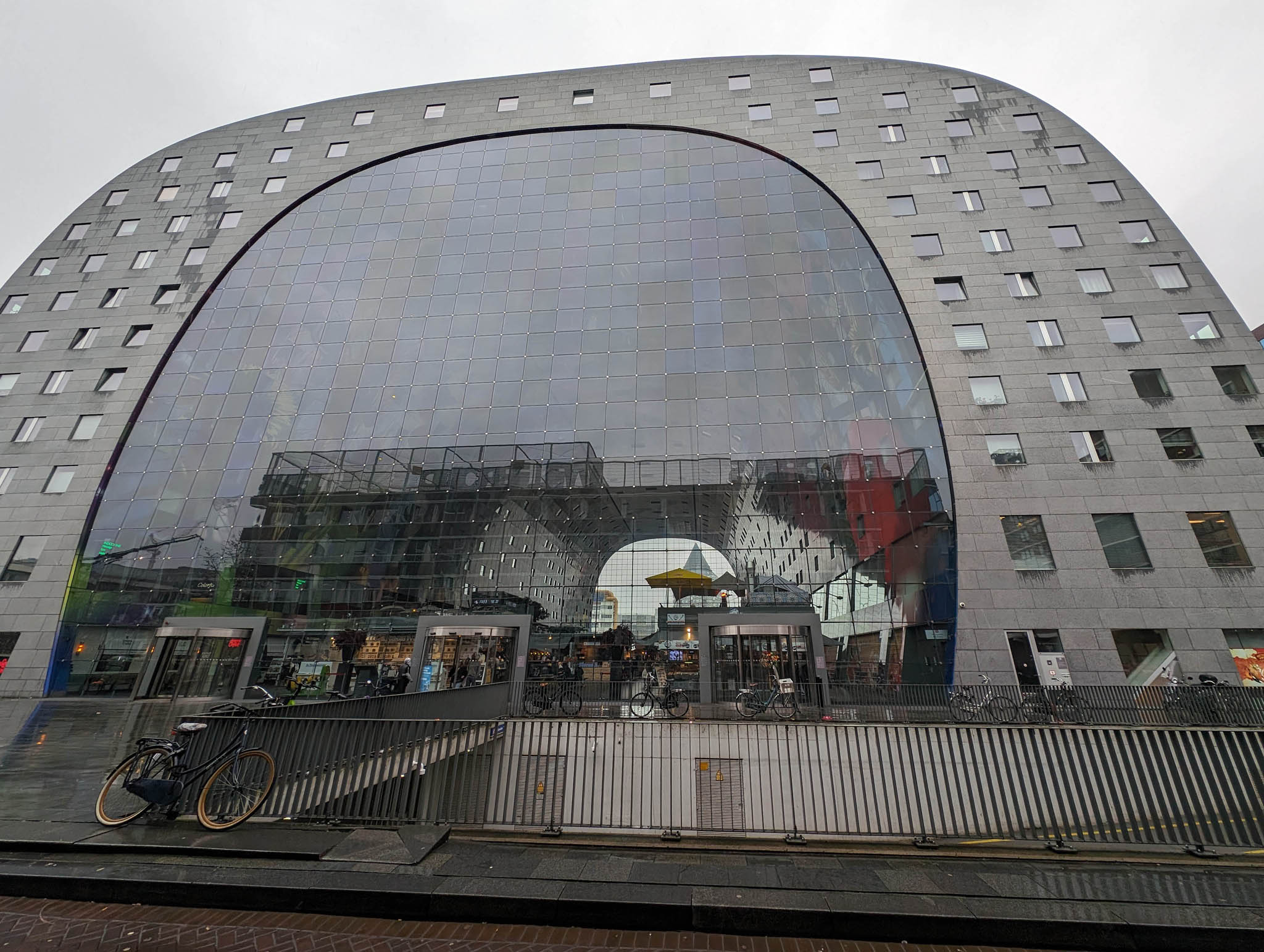 The all-aboard time for the cruise ship was one in the afternoon so we’d gone to bed on the penultimate night of the 2024 cruise on Aurora with the expectation that we’d have time to get out and do some more sightseeing in the morning. The weather had different thoughts on the matter, though, so we shrunk our rough plan down to the basics instead, popped out, took the Metro one stop up to save on walking and getting damper than we needed to be, and headed back into Binnenrotte Square where we’d been drinking the evening before to finally took a look around the Markthal.