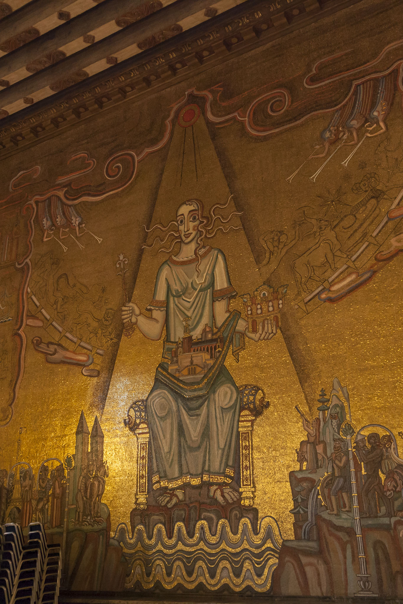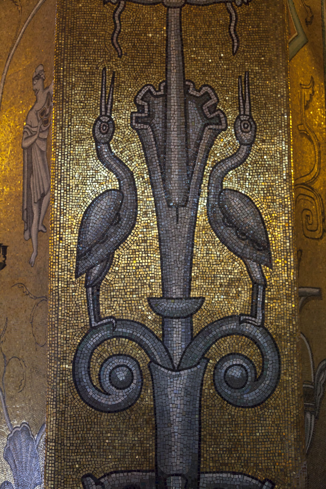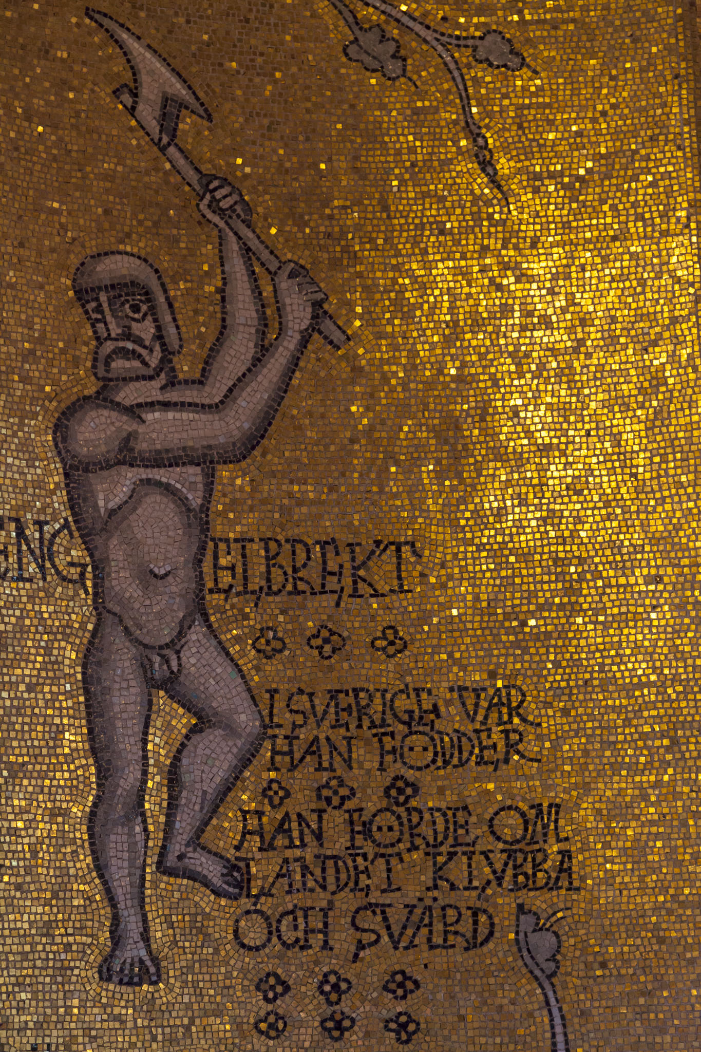 The mosaic images depict elements from Swedish history, the largest piece of work being reserved for the far wall from the entrance where a large personification of Stockholm as a woman (The Queen of Lake Mälaren) gazes down on the rest of the world.
