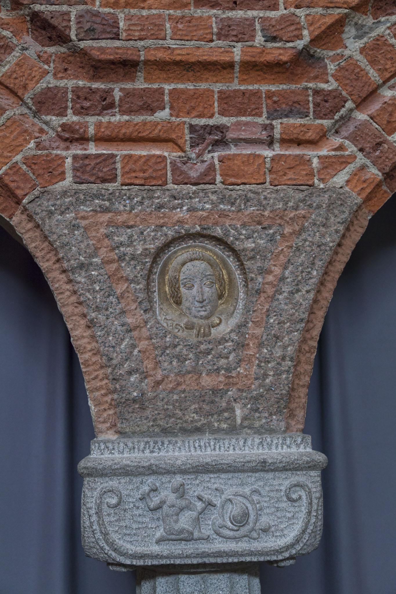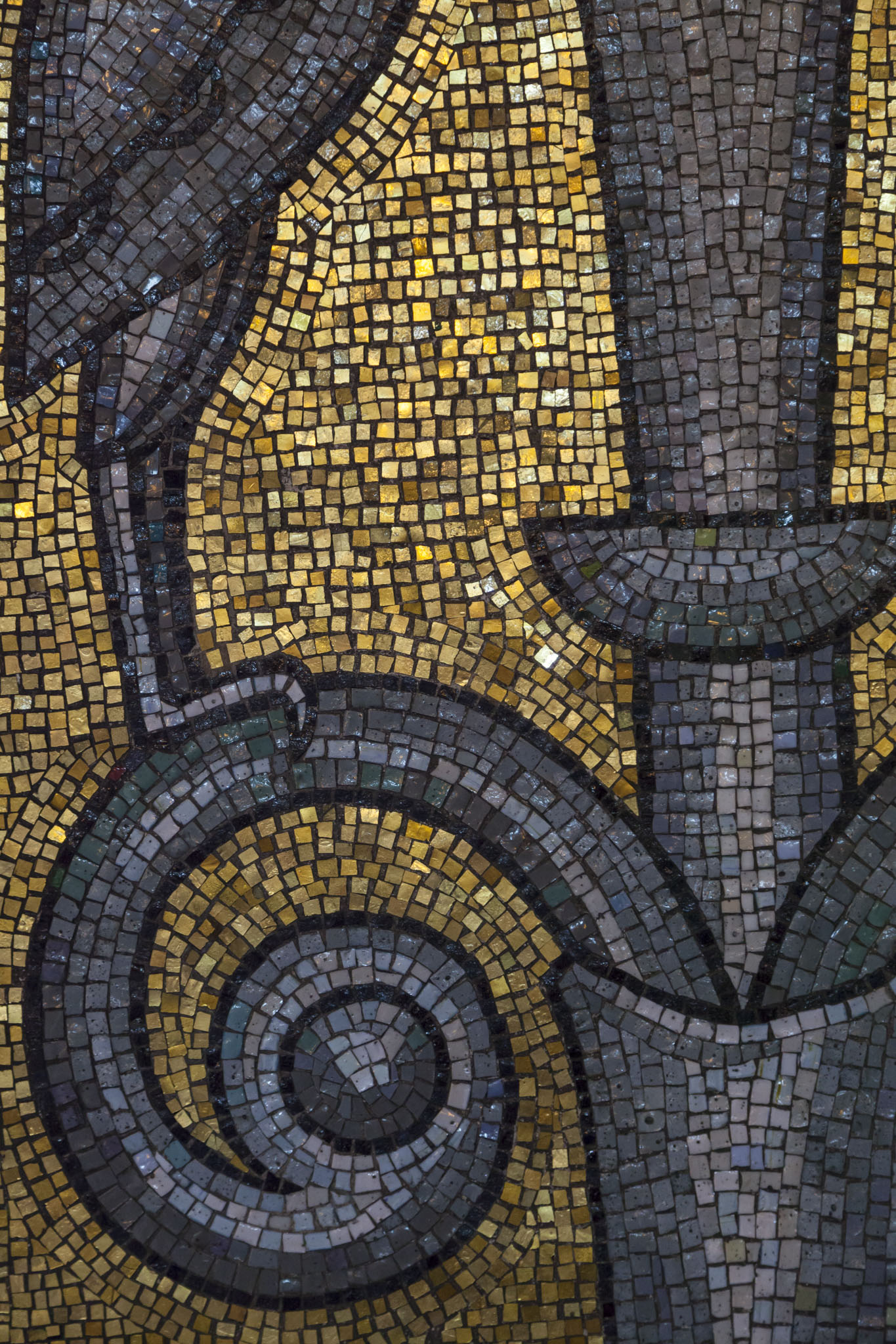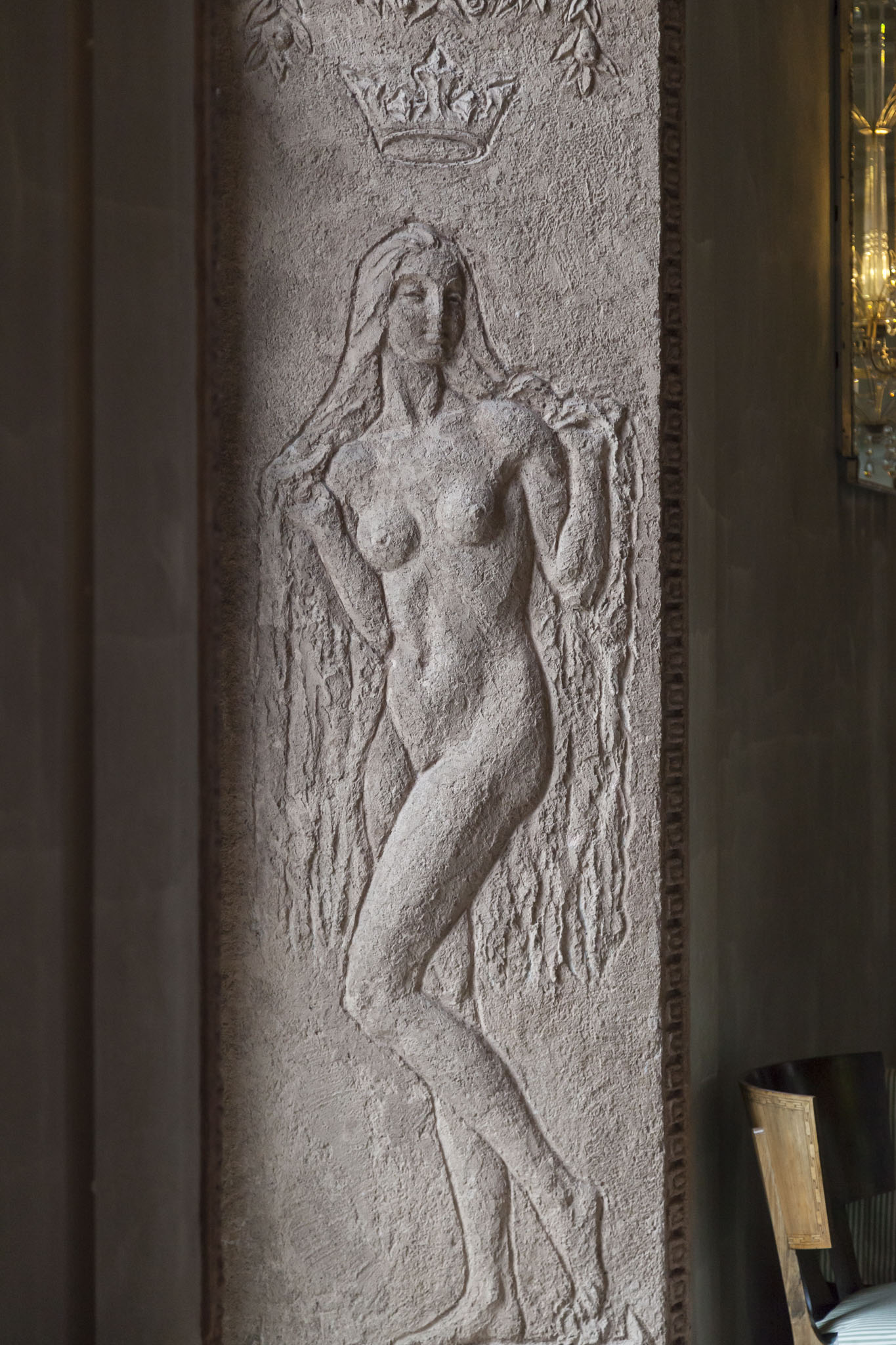 The mosaic images depict elements from Swedish history, the largest piece of work being reserved for the far wall from the entrance where a large personification of Stockholm as a woman (The Queen of Lake Mälaren) gazes down on the rest of the world.