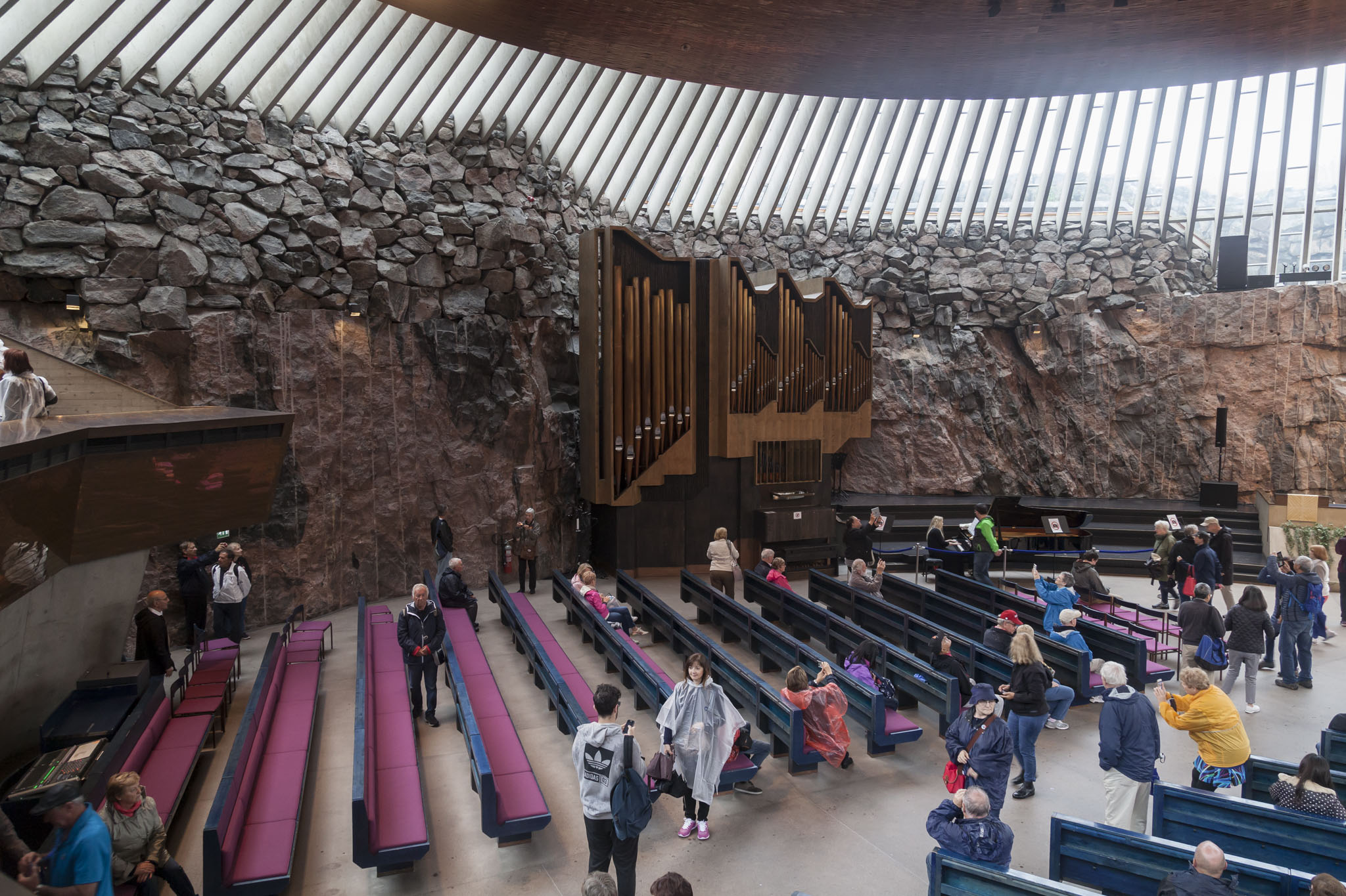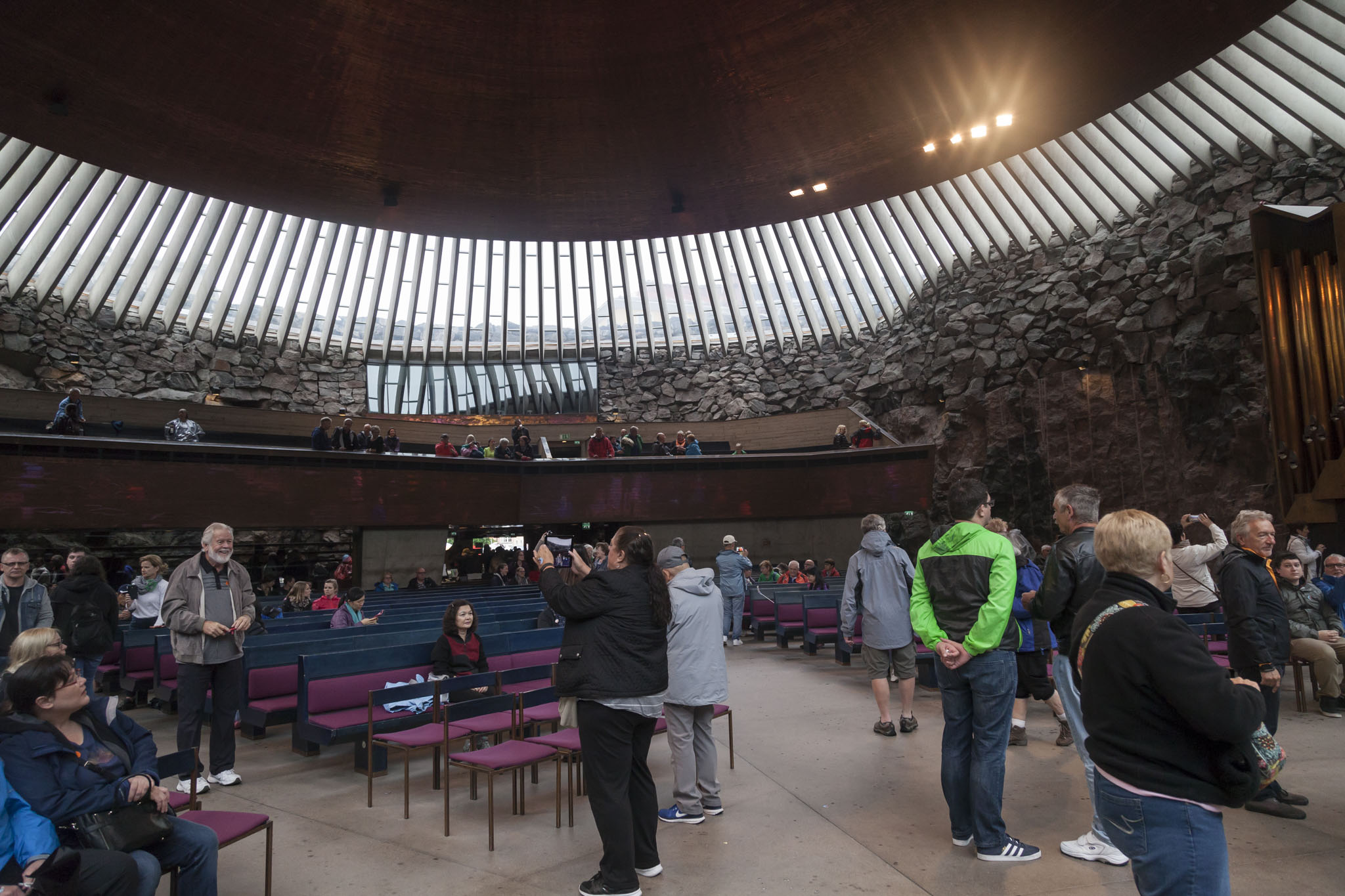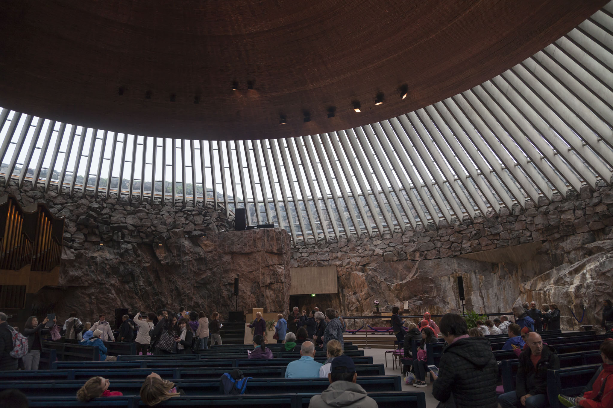 Temppeliaukion is a Lutheran church built in the late 60s by architect brothers and, as its name suggests, is a church built into solid rock. The original plans called for a church around four times larger. The entrance to the church was tightly packed with visitors purchasing tickets and we needed to group together while our tour guide did the purchasing for us and sticking tour stickers on us so we could enter. Our main concern at this point was getting under some cover so that coupled with the lack of much light in that entrance area meant I skipped taking pictures here too. Once inside, however, there was plenty of space to walk around and admire the architecture and design and material choices of the building.