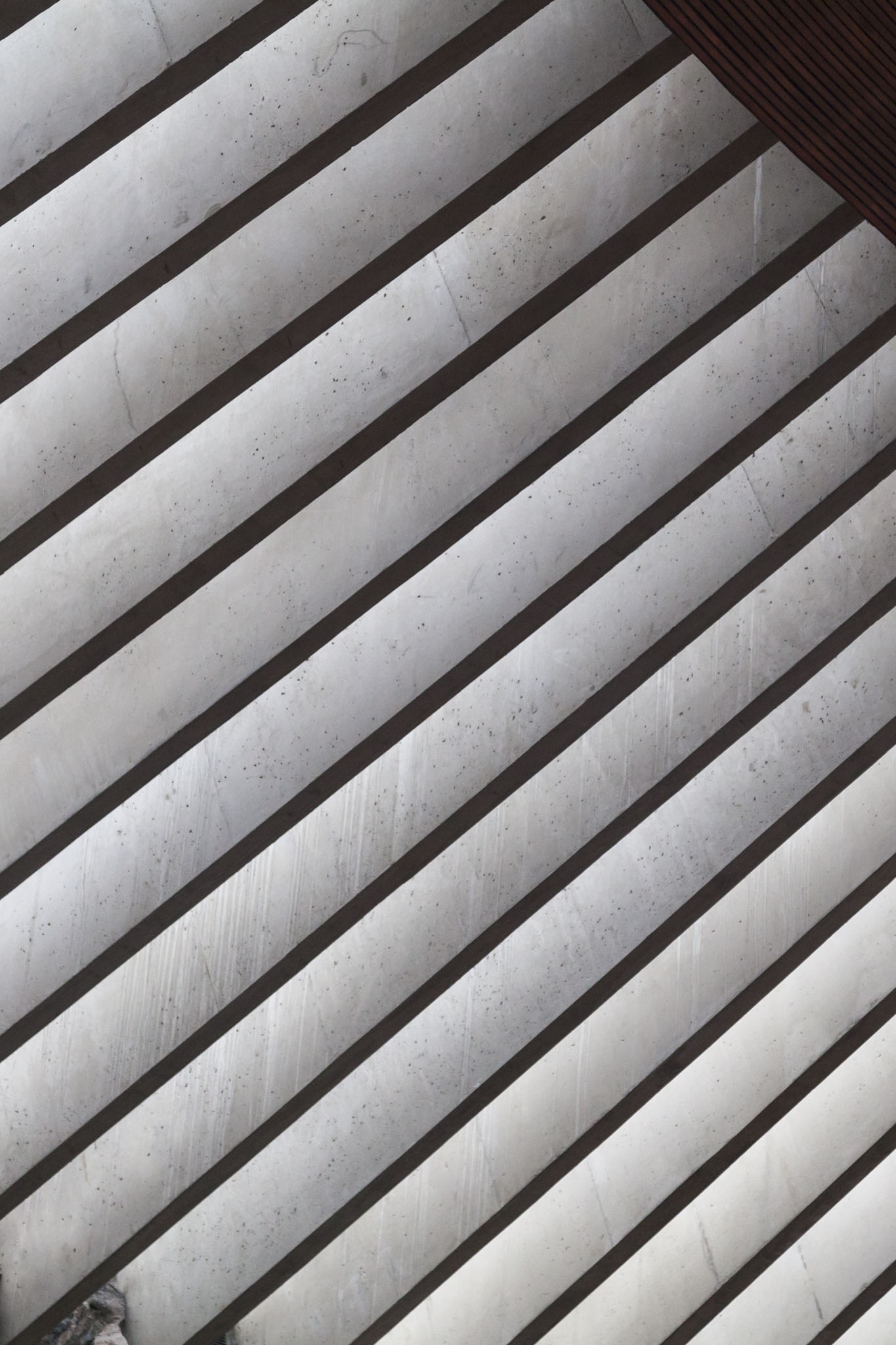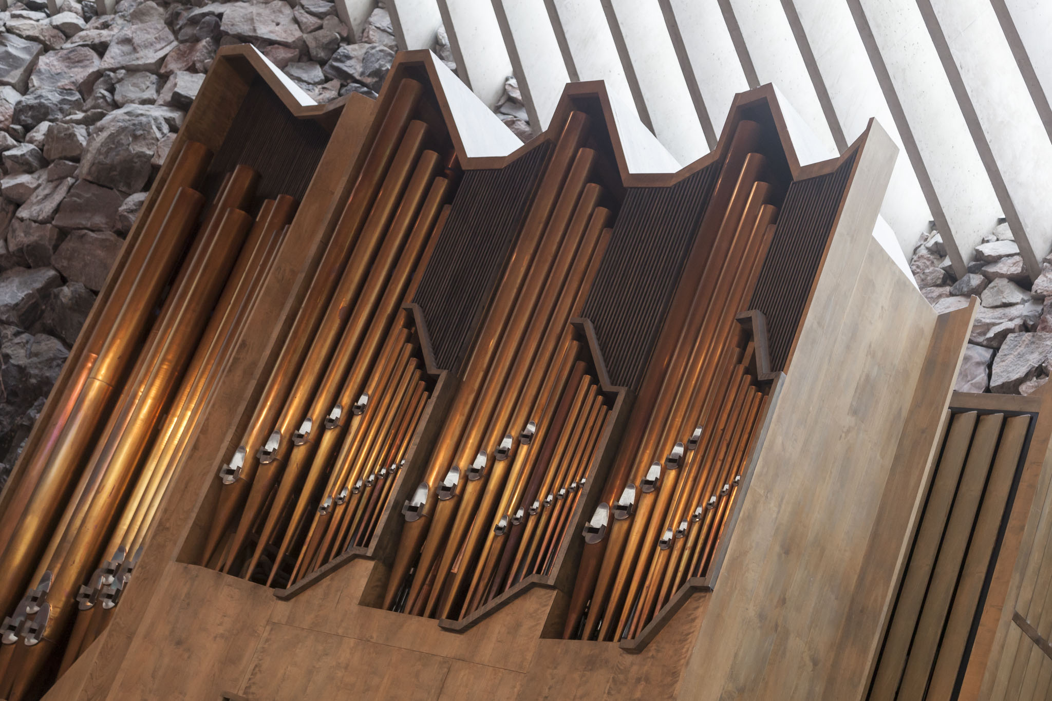 The original design did not have exposed walls but it was discovered that the acoustics were superb in this raw state so they were left that way deliberately. A curved copper dome supported by delightfully brutalist concrete beams channelled natural light into the church although there wasn’t a great deal of that on this particular day.