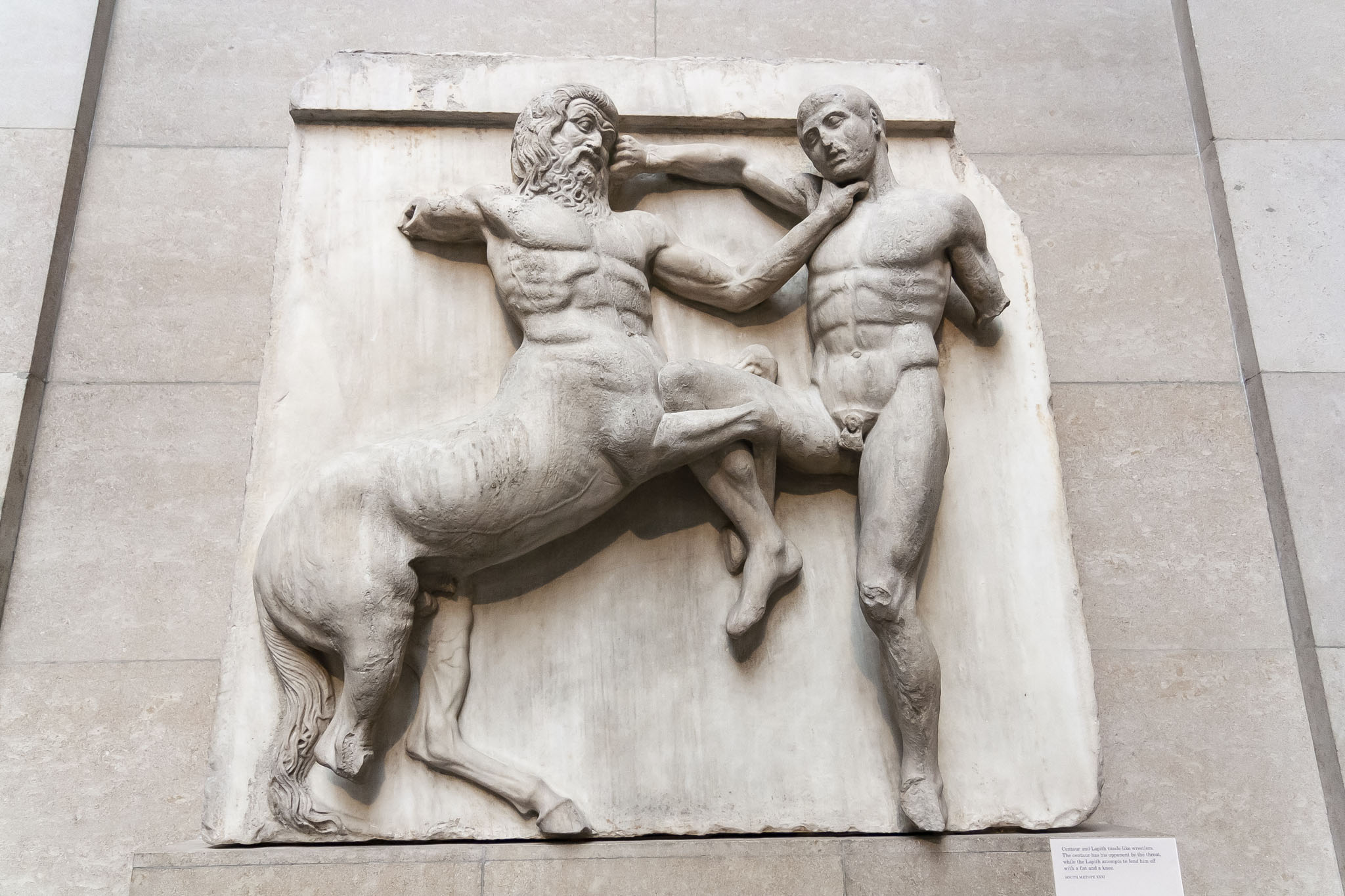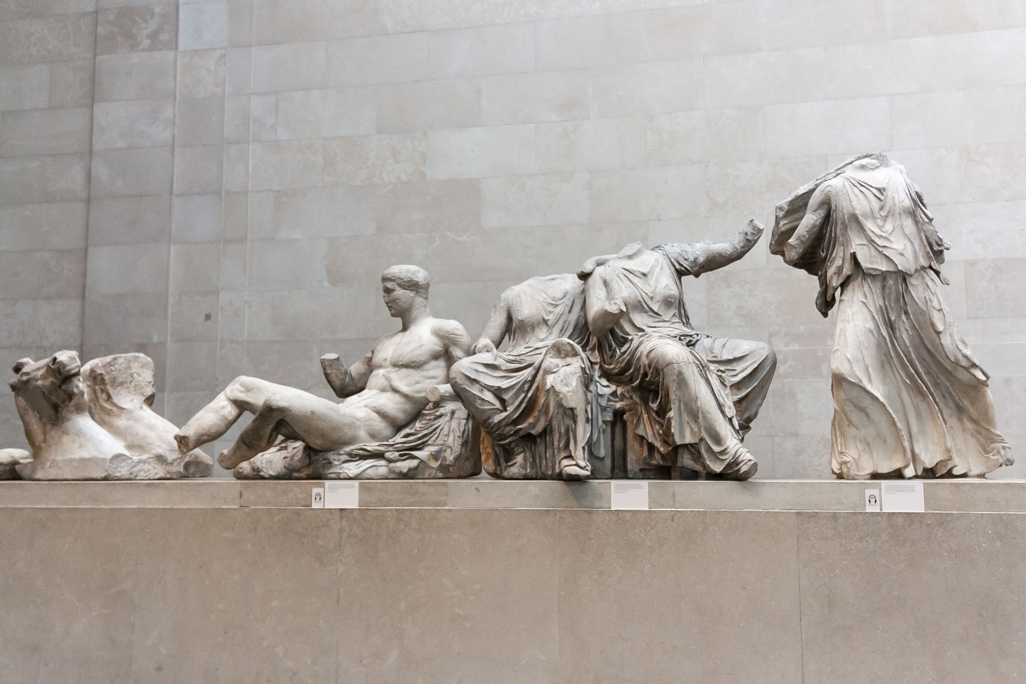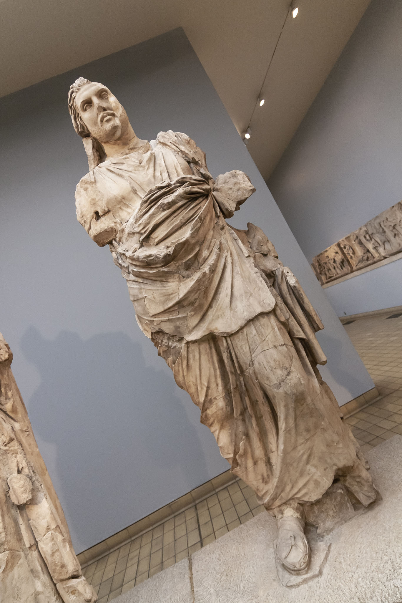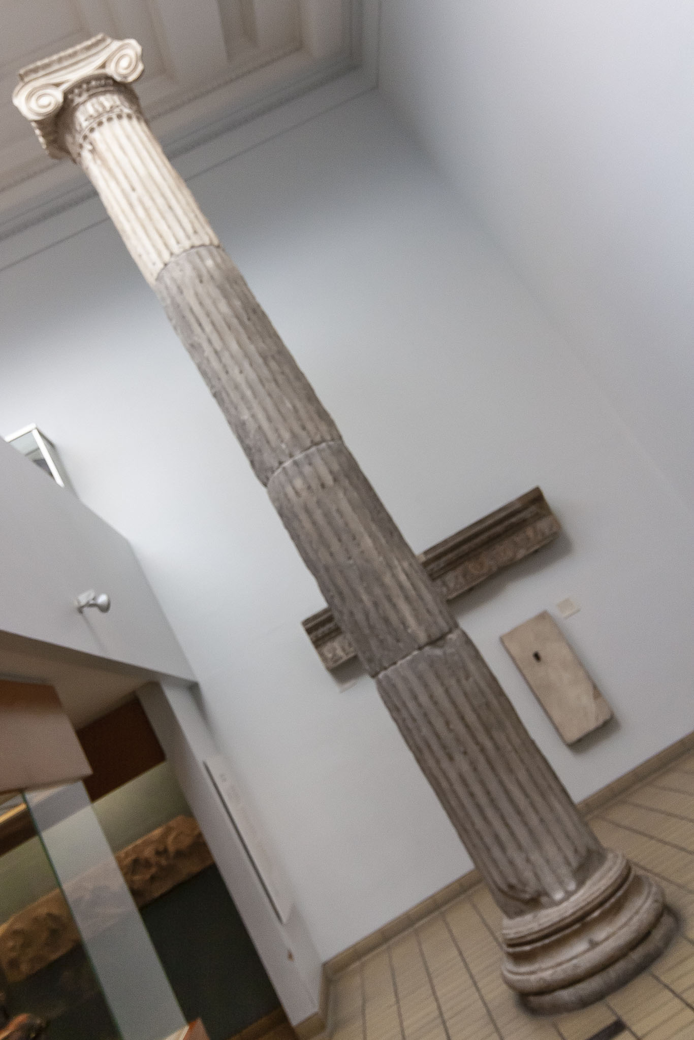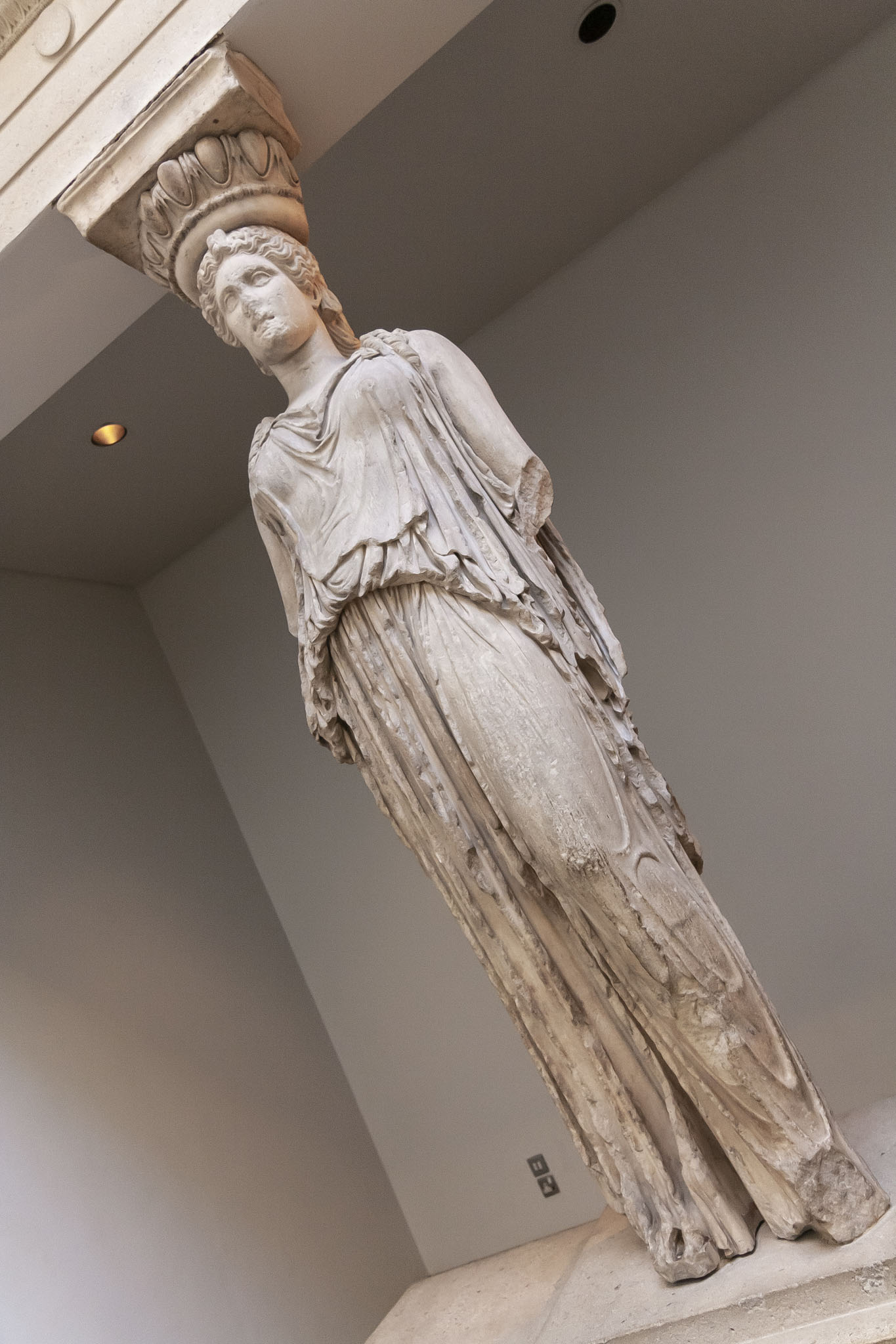 The column below on the left originally came from the Acropolis in Athens, from the Erechtheion rather than the Parthenon. The female figure column to the right is a Caryatid from the same building. Both were taken by Lord Elgin and later sold to the British Museum. Beneath the two columns is a photo of the infamous Elgin Marbles. Less spherical and glassy than you might imagine.