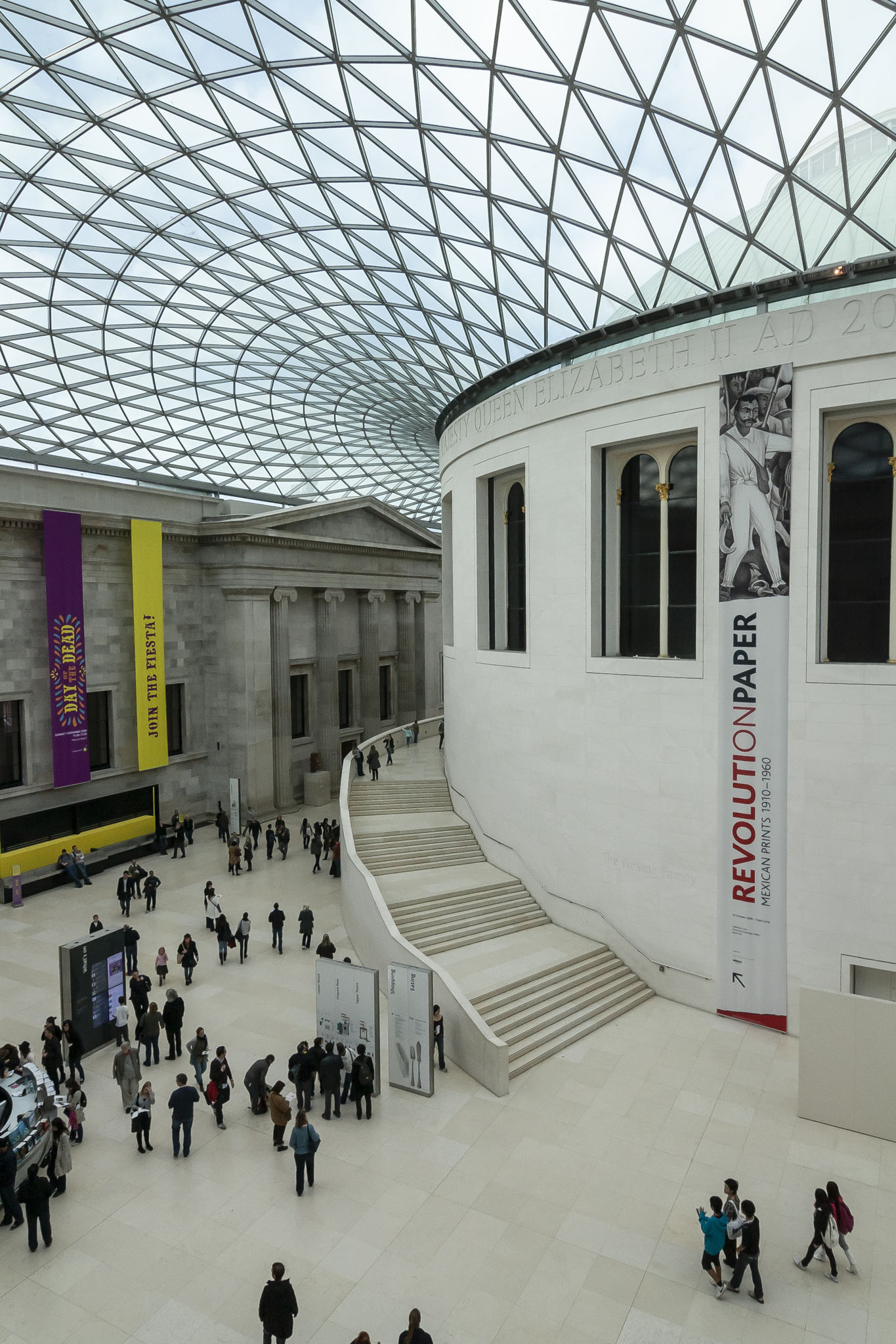 Briefly looking at the building, since I’m a bit of an architecture-fan, the British Museum was founded in the 1750s but the main, neoclassical structure that people walk around today and that we visited in 2009 is from nearly a century later owing to the need to expand in order to incorporate all the artifacts appropriated from around the world. One of the most distinctive areas inside is the very modern, glass-roofed Queen Elizabeth II Great Court which was designed by Norman Foster and opened to the public in 2000.